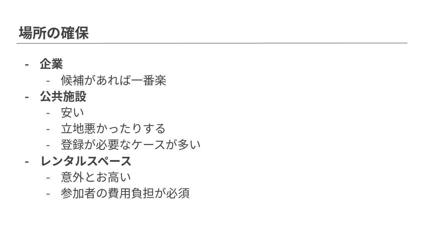 ⽴地悪かったりする - 登録が必要なケースが多い - レンタルスペース - 意外とお⾼い - 参加者の費⽤負担が必須