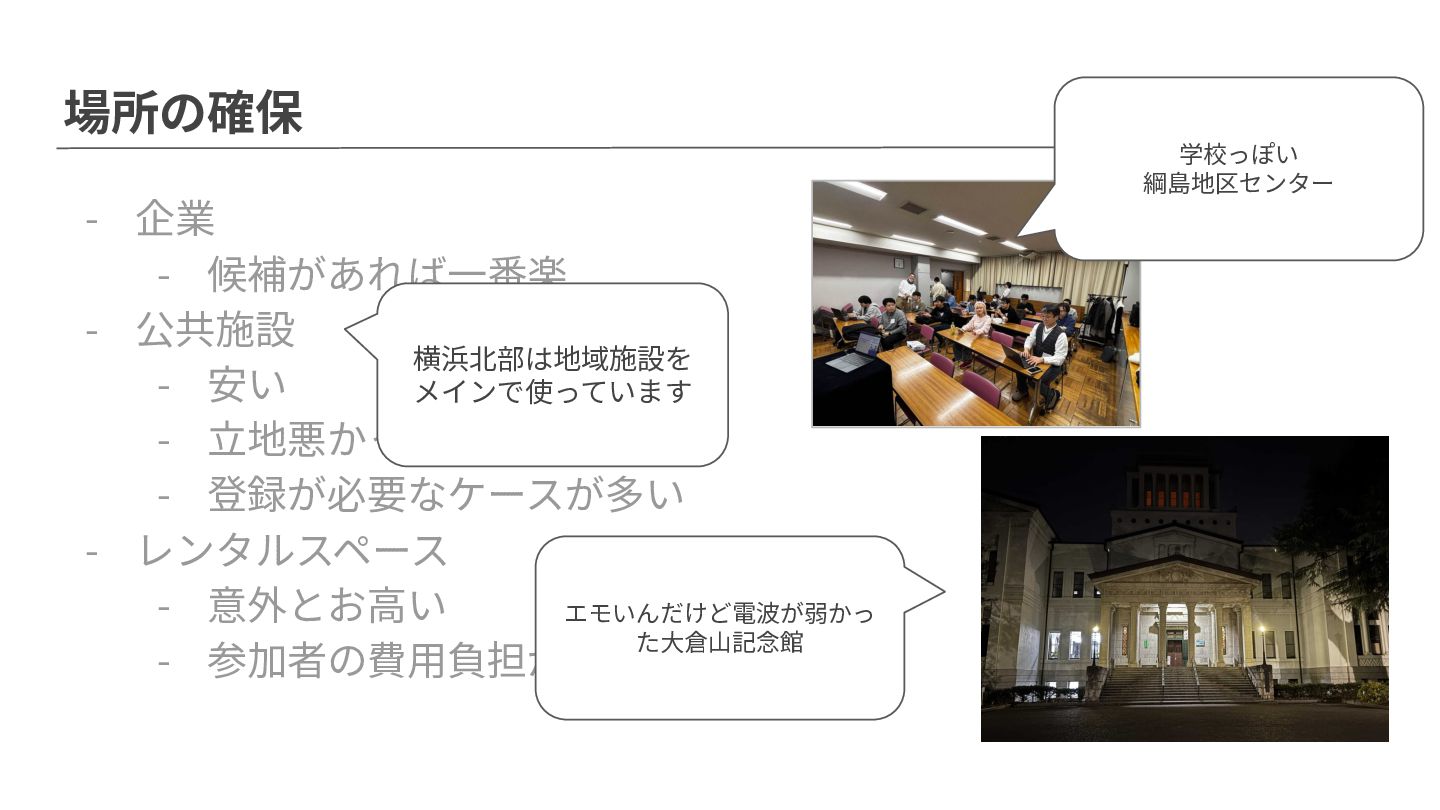 ⽴地悪かったりする - 登録が必要なケースが多い - レンタルスペース - 意外とお⾼い - 参加者の費⽤負担が必須 横浜北部は地域施設を メインで使っています エモいんだけど電波が弱かっ た⼤倉⼭記念館 学校っぽい 綱島地区センター