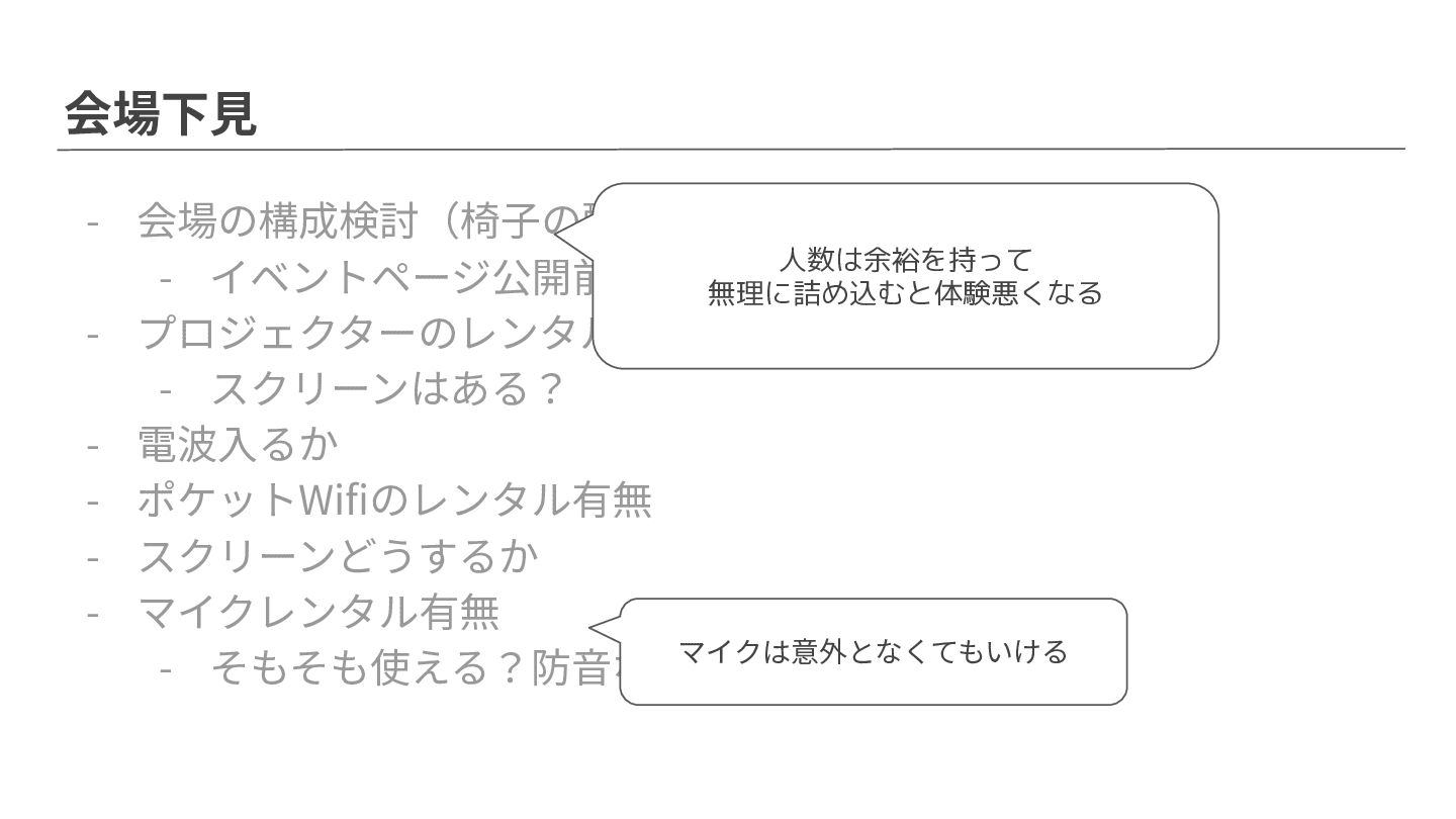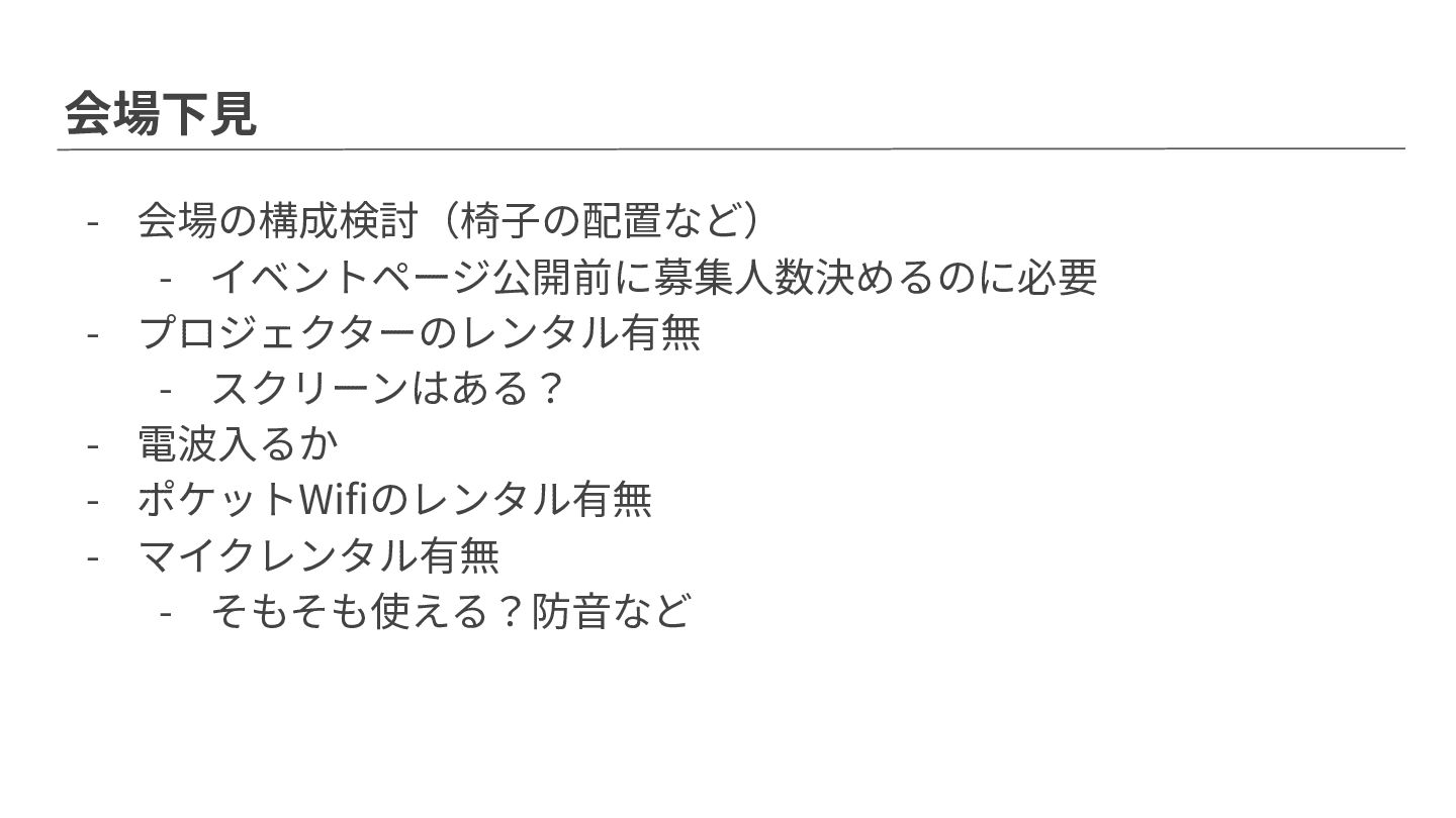 会場下⾒ - 会場の構成検討(椅⼦の配置など) - イベントページ公開前に募集⼈数決めるのに必要 - プロジェクターのレンタル有無 - スクリーンはある? -