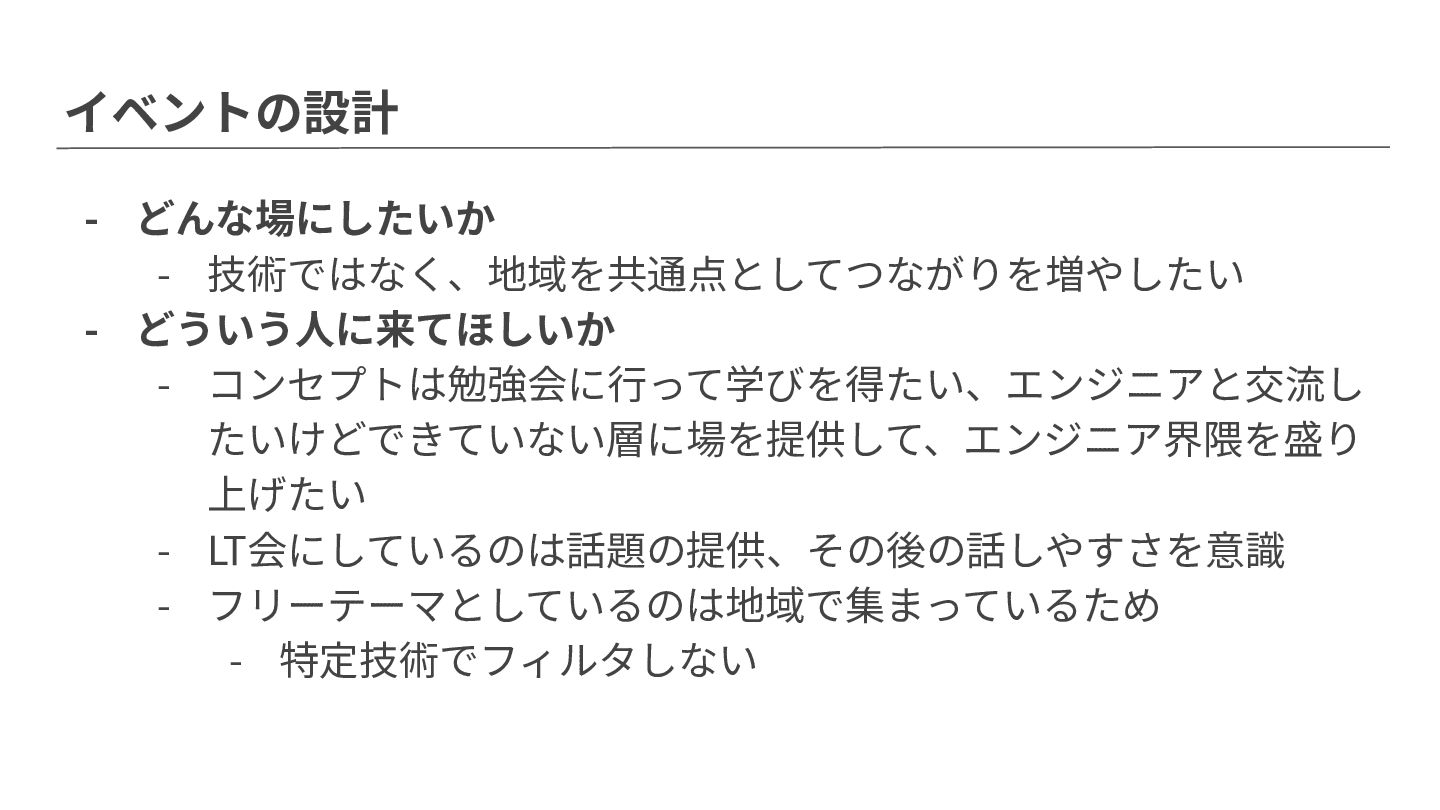 上げたい - LT会にしているのは話題の提供、その後の話しやすさを意識 - フリーテーマとしているのは地域で集まっているため - 特定技術でフィルタしない