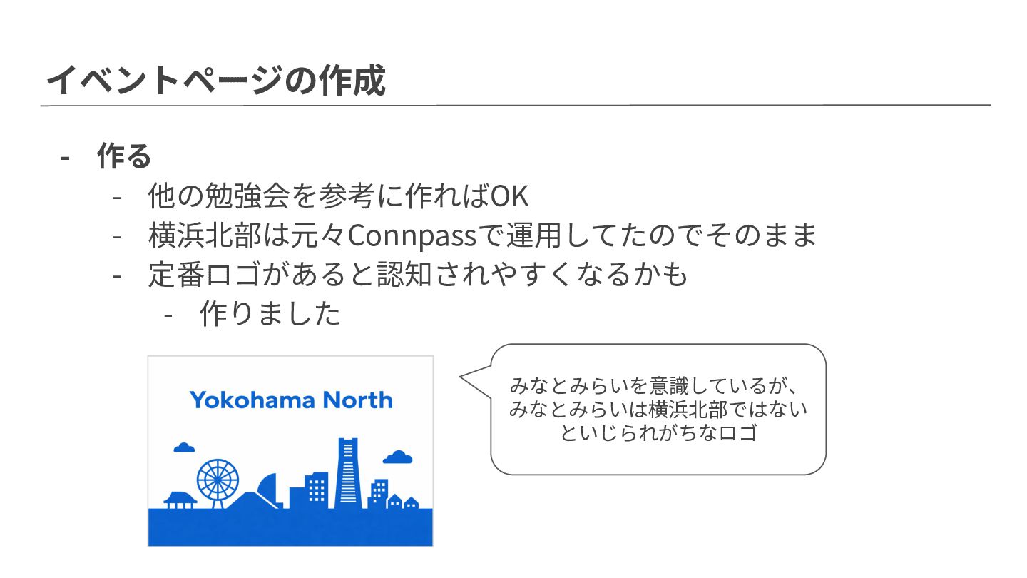 イベントページの作成 - 作る - 他の勉強会を参考に作ればOK - 横浜北部は元々Connpassで運⽤してたのでそのまま - 定番ロゴがあると認知されやすくなるかも -