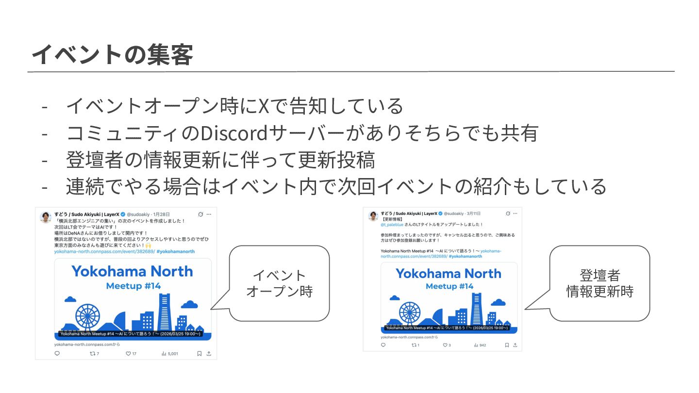 イベントの集客 - イベントオープン時にXで告知している - コミュニティのDiscordサーバーがありそちらでも共有 - 登壇者の情報更新に伴って更新投稿 - 連続でやる場合はイベント内で次回イベントの紹介もしている イベント