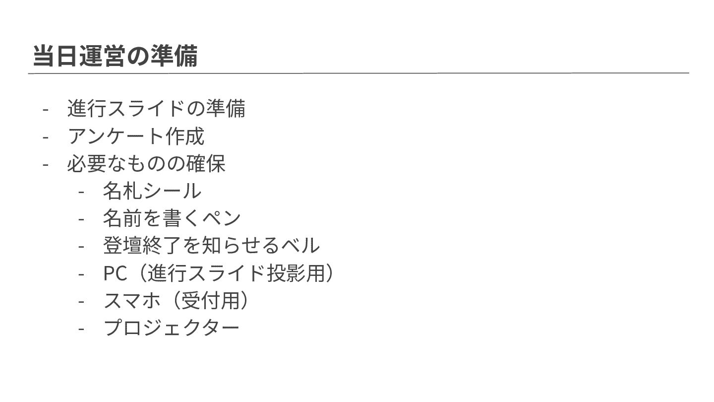 当⽇運営の準備 - 進⾏スライドの準備 - アンケート作成 - 必要なものの確保 - 名札シール -