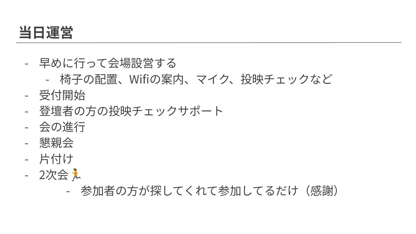 会の進⾏ - 懇親会 - ⽚付け - 2次会🏃 - 参加者の⽅が探してくれて参加してるだけ(感謝)