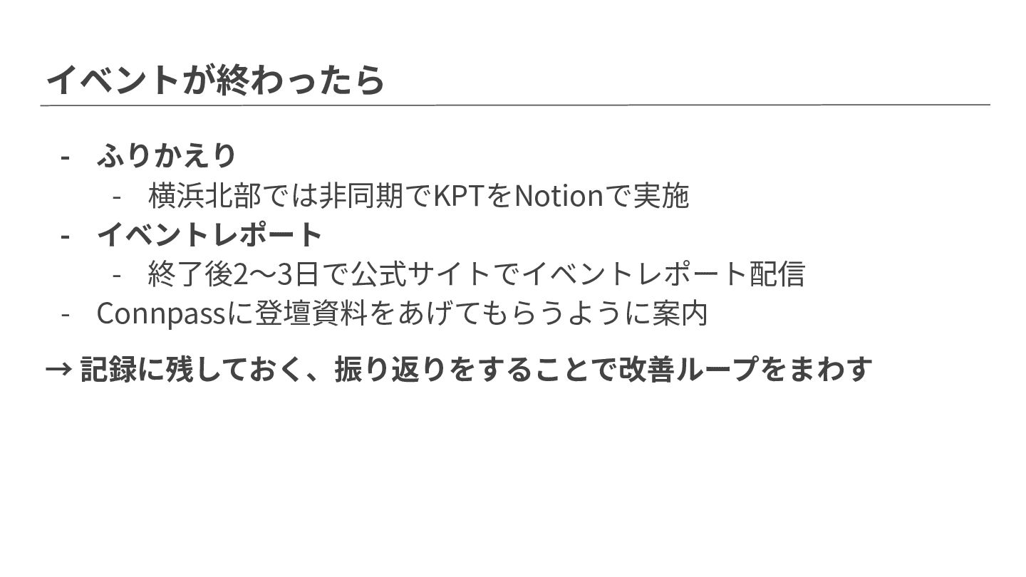 イベントが終わったら - ふりかえり - 横浜北部では⾮同期でKPTをNotionで実施 - イベントレポート - 終了後2〜3⽇で公式サイトでイベントレポート配信 -