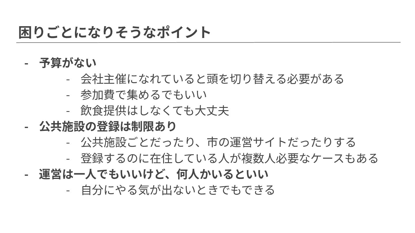 困りごとになりそうなポイント - 予算がない - 会社主催になれていると頭を切り替える必要がある - 参加費で集めるでもいい - 飲⾷提供はしなくても⼤丈夫 -