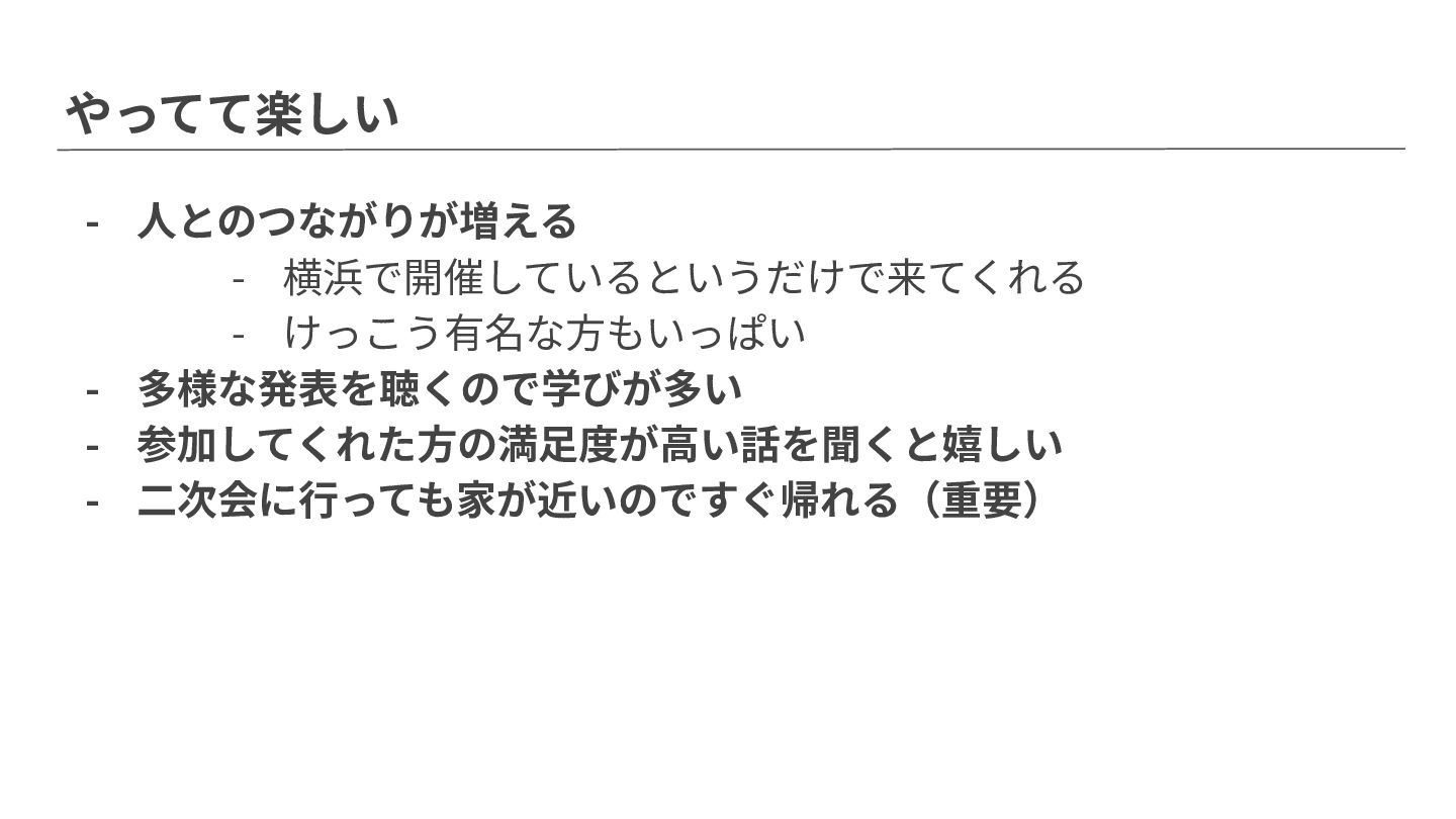 やってて楽しい - ⼈とのつながりが増える - 横浜で開催しているというだけで来てくれる - けっこう有名な⽅もいっぱい - 多様な発表を聴くので学びが多い -