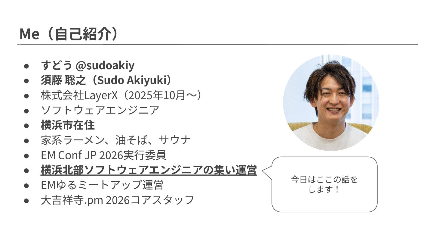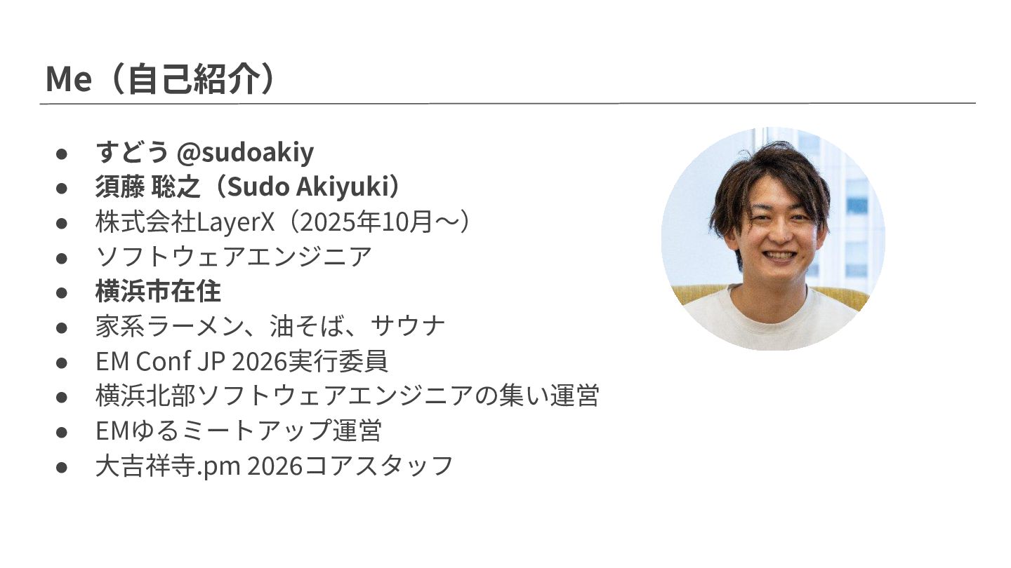 • ソフトウェアエンジニア • 横浜市在住 • 家系ラーメン、油そば、サウナ • EM Conf JP 2026実⾏委員 • 横浜北部ソフトウェアエンジニアの集い運営 • EMゆるミートアップ運営 • ⼤吉祥寺.pm 2026コアスタッフ 今⽇はここの話を します!