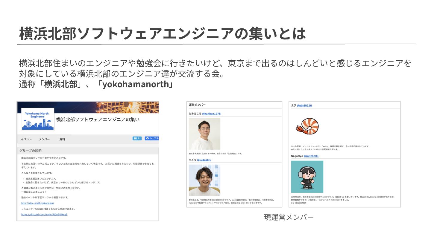 横浜北部ソフトウェアエンジニアの集いとは 横浜北部住まいのエンジニアや勉強会に⾏きたいけど、東京まで出るのはしんどいと感じるエンジニアを 対象にしている横浜北部のエンジニア達が交流する会。 通称「横浜北部」、「yokohamanorth」 現運営メンバー