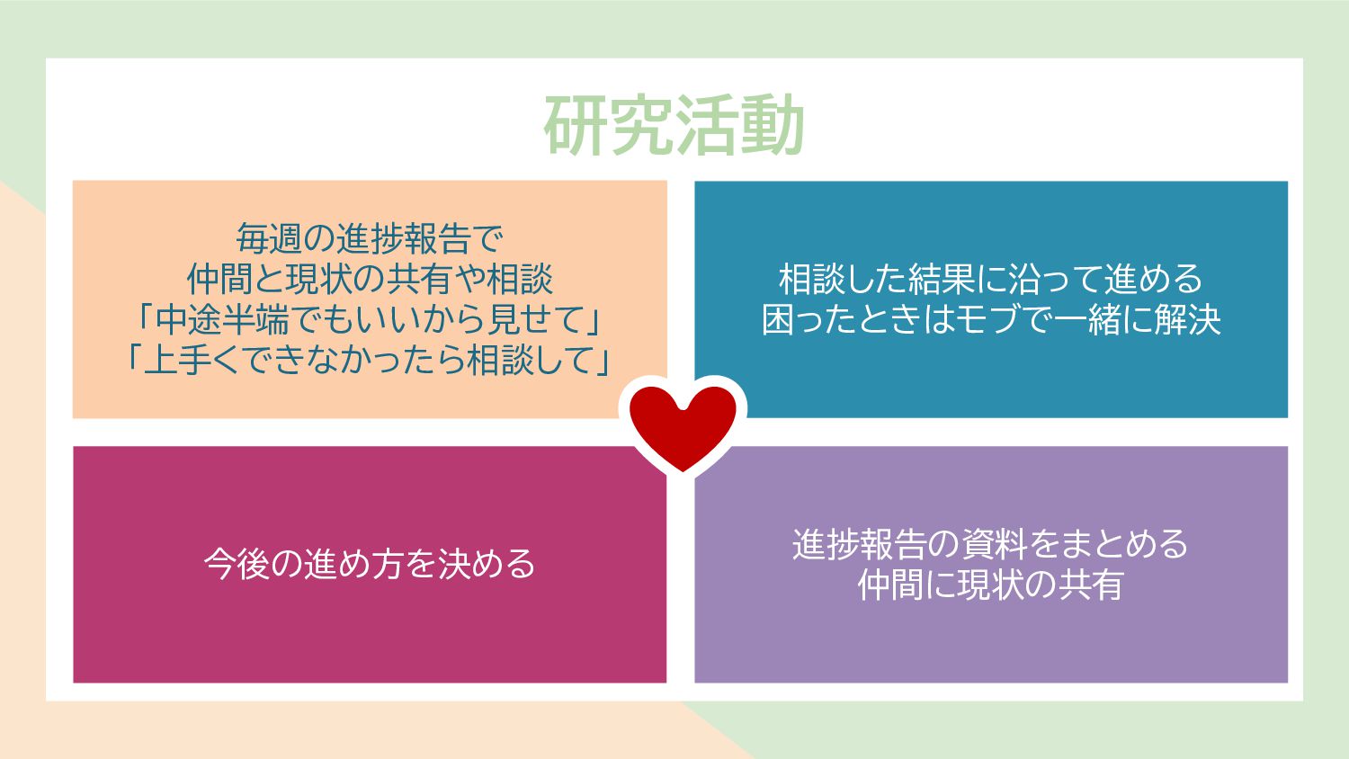 研究活動 毎週の進捗報告で 仲間と現状の共有や相談 「中途半端でもいいから見せて」 「上手くできなかったら相談して」 今後の進め方を決める 相談した結果に沿って進める 困ったときはモブで一緒に解決 進捗報告の資料をまとめる 仲間に現状の共有