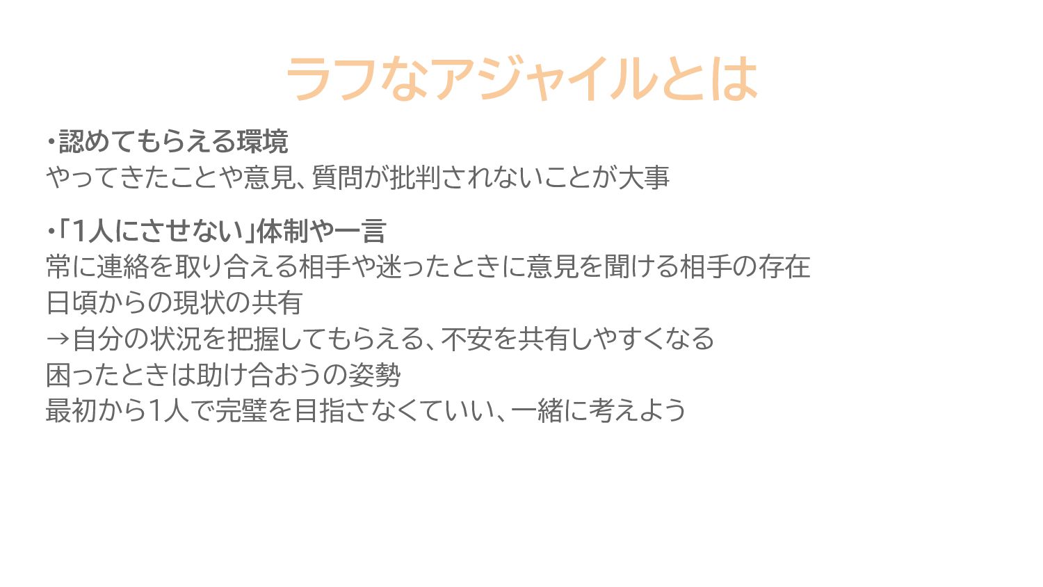 ラフなアジャイルとは ・認めてもらえる環境 やってきたことや意見、質問が批判されないことが大事 ・「1人にさせない」体制や一言 常に連絡を取り合える相手や迷ったときに意見を聞ける相手の存在 日頃からの現状の共有 →自分の状況を把握してもらえる、不安を共有しやすくなる 困ったときは助け合おうの姿勢 最初から1人で完璧を目指さなくていい、一緒に考えよう