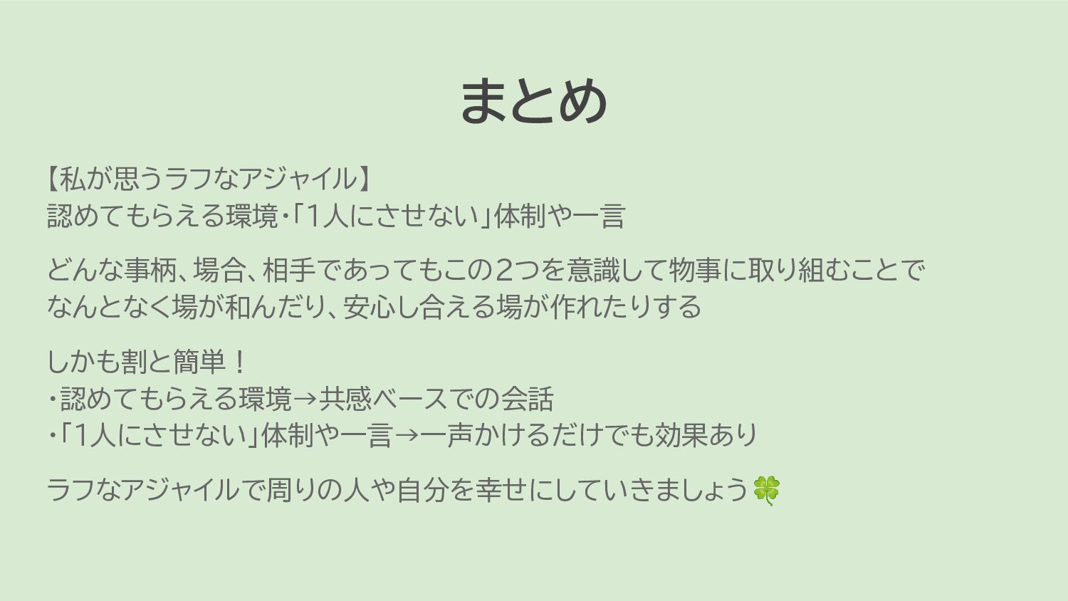 まとめ 【私が思うラフなアジャイル】 認めてもらえる環境・「1人にさせない」体制や一言 どんな事柄、場合、相手であってもこの2つを意識して物事に取り組むことで なんとなく場が和んだり、安心し合える場が作れたりする しかも割と簡単! ・認めてもらえる環境→共感ベースでの会話 ・「1人にさせない」体制や一言→一声かけるだけでも効果あり ラフなアジャイルで周りの人や自分を幸せにしていきましょう🍀