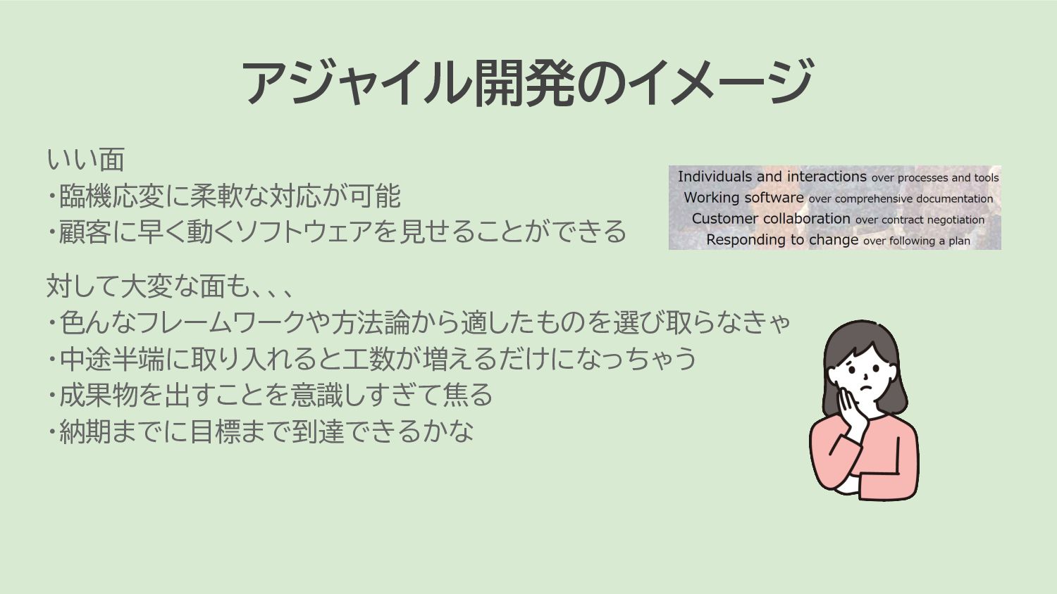 アジャイル開発のイメージ いい面 ・臨機応変に柔軟な対応が可能 ・顧客に早く動くソフトウェアを見せることができる 対して大変な面も、、、 ・色んなフレームワークや方法論から適したものを選び取らなきゃ ・中途半端に取り入れると工数が増えるだけになっちゃう ・成果物を出すことを意識しすぎて焦る ・納期までに目標まで到達できるかな