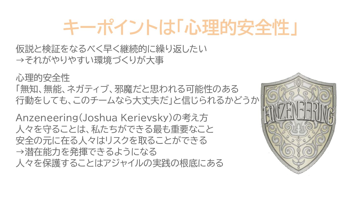 キーポイントは「心理的安全性」 仮説と検証をなるべく早く継続的に繰り返したい →それがやりやすい環境づくりが大事 心理的安全性 「無知、無能、ネガティブ、邪魔だと思われる可能性のある 行動をしても、このチームなら大丈夫だ」と信じられるかどうか Anzeneering(Joshua Kerievsky)の考え方 人々を守ることは、私たちができる最も重要なこと 安全の元に在る人々はリスクを取ることができる