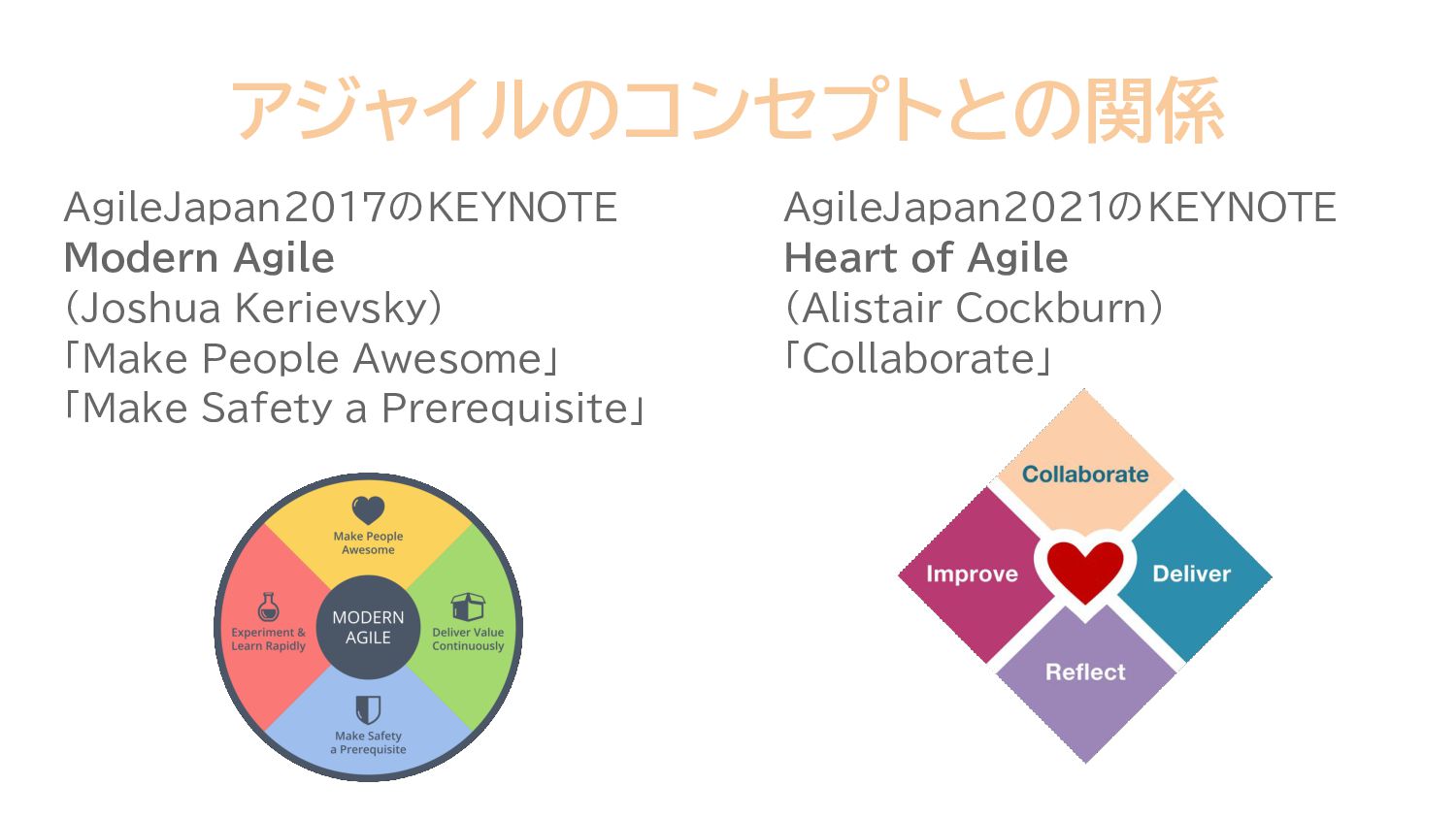 アジャイルのコンセプトとの関係 AgileJapan2017のKEYNOTE Modern Agile (Joshua Kerievsky) 「Make People Awesome」 「Make