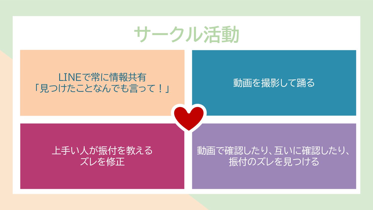 サークル活動 LINEで常に情報共有 「見つけたことなんでも言って!」 上手い人が振付を教える ズレを修正 動画を撮影して踊る 動画で確認したり、互いに確認したり、 振付のズレを見つける