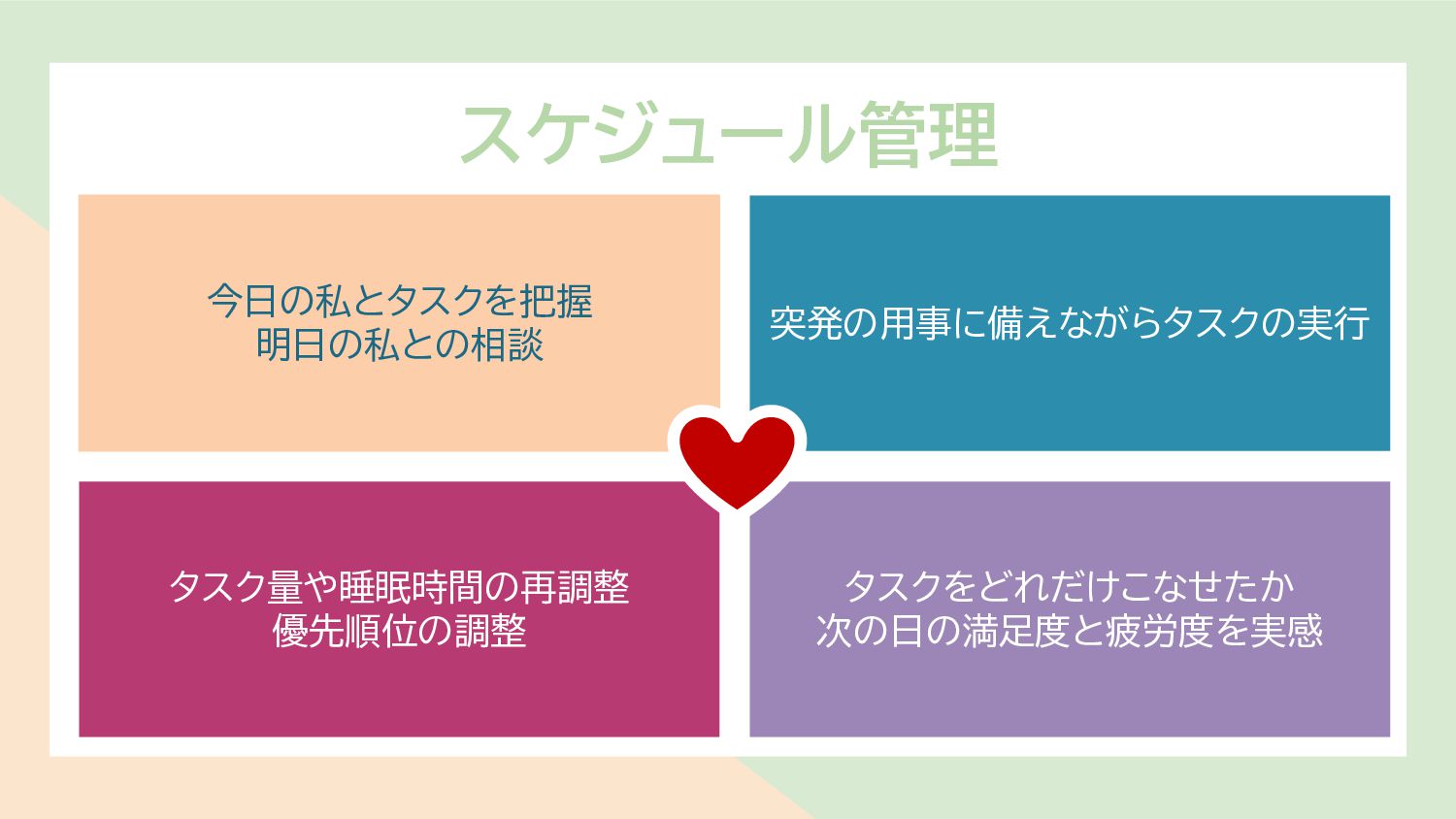 スケジュール管理 今日の私とタスクを把握 明日の私との相談 タスク量や睡眠時間の再調整 優先順位の調整 突発の用事に備えながらタスクの実行 タスクをどれだけこなせたか 次の日の満足度と疲労度を実感