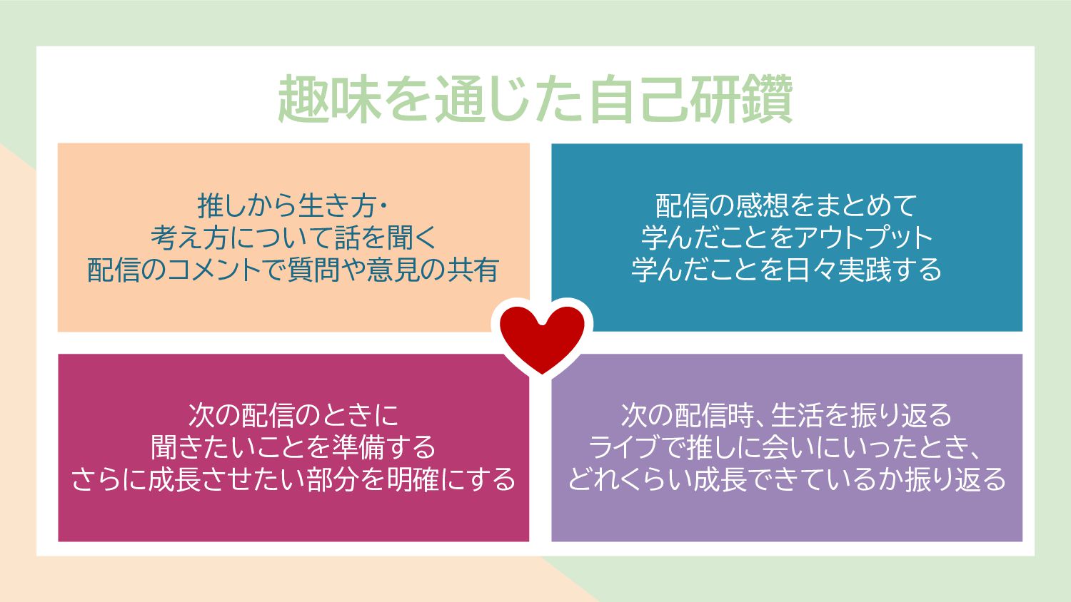 趣味を通じた自己研鑽 推しから生き方・ 考え方について話を聞く 配信のコメントで質問や意見の共有 次の配信のときに 聞きたいことを準備する さらに成長させたい部分を明確にする 配信の感想をまとめて 学んだことをアウトプット 学んだことを日々実践する