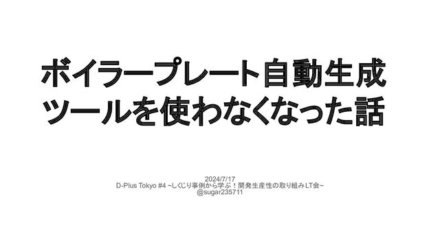ボイラープレート自動生成 ツールを使わなくなった話 2024/7/17 D-Plus Tokyo #4 ~しくじり事例から学ぶ!開発生産性の取り組みLT会~ @sugar235711