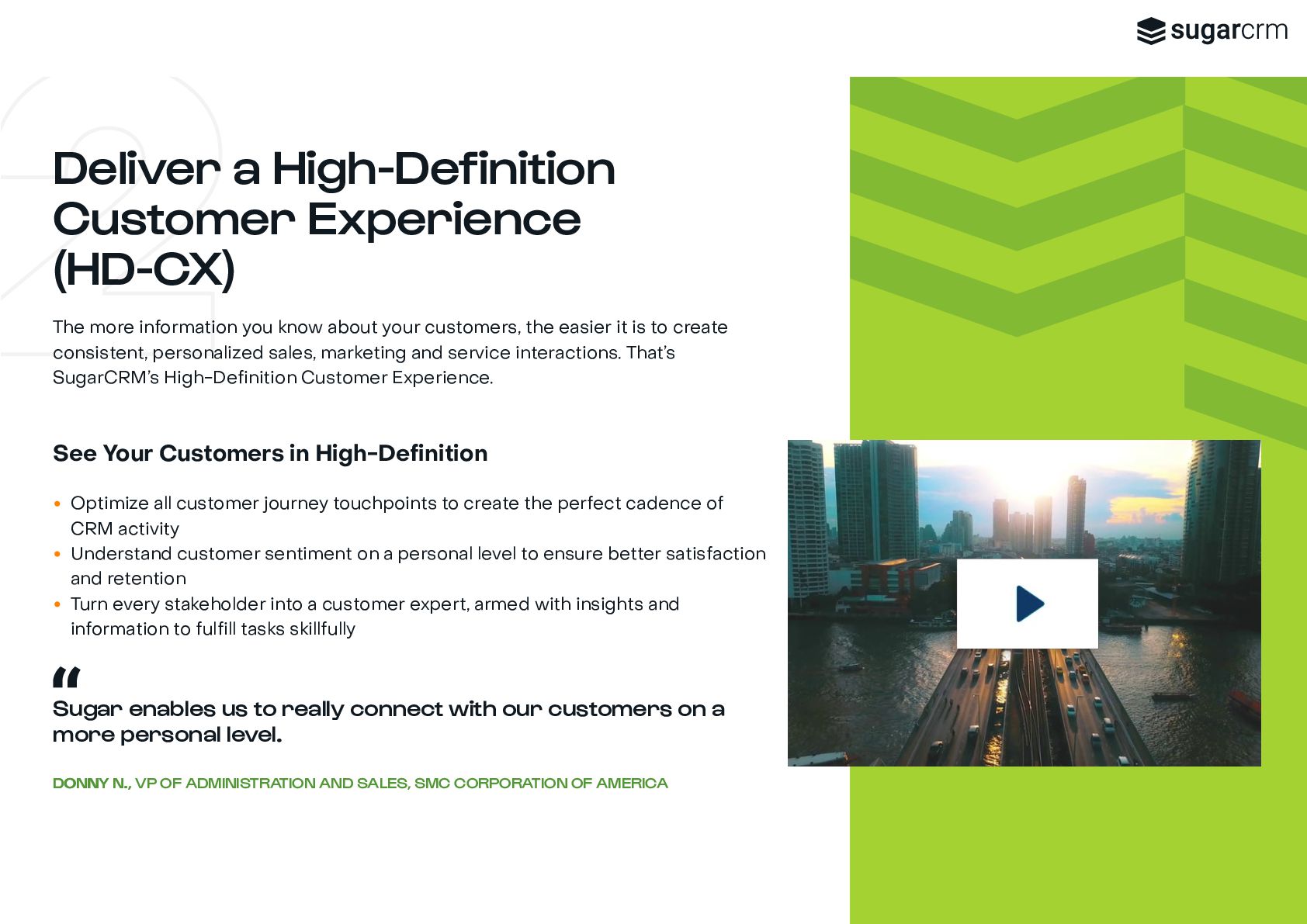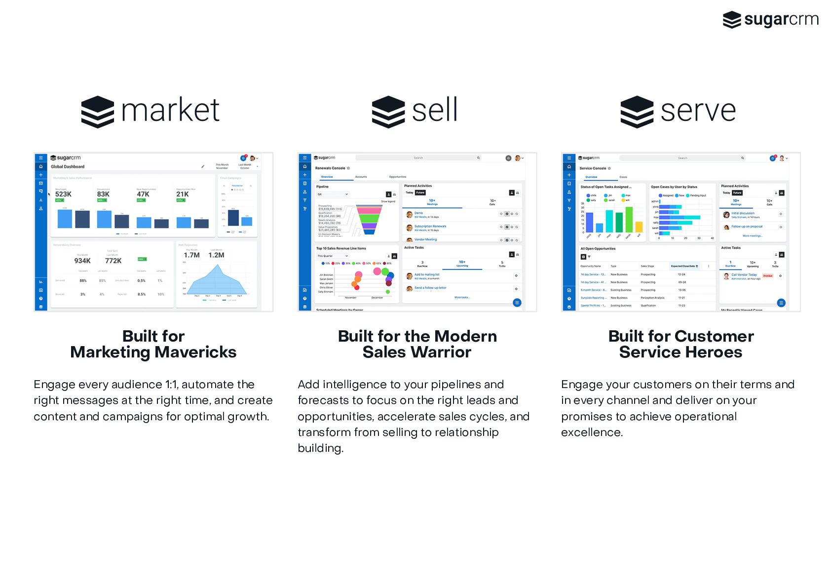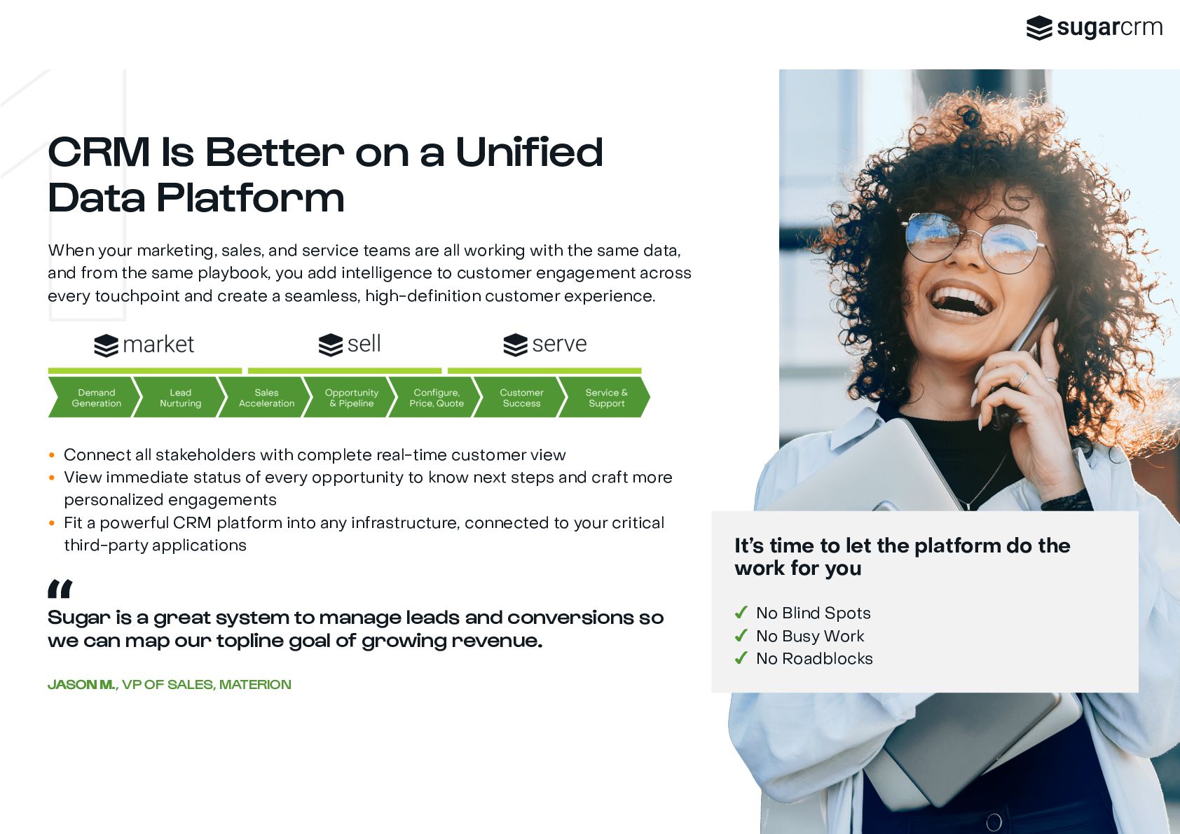 marketing, sales, and service teams are all working with the same data, and from the same playbook, you add intelligence to customer engagement across every touchpoint and create a seamless, high-definition customer experience. Sugar is a great system to manage leads and conversions so we can map our topline goal of growing revenue. J JA ASON M. SON M., VP OF SALES, MATERION It’s time to let the platform do the work for you ✔ No Blind Spots ✔ No Busy Work ✔ No Roadblocks Connect all stakeholders with complete real-time customer view View immediate status of every opportunity to know next steps and craft more personalized engagements Fit a powerful CRM platform into any infrastructure, connected to your critical third-party applications
