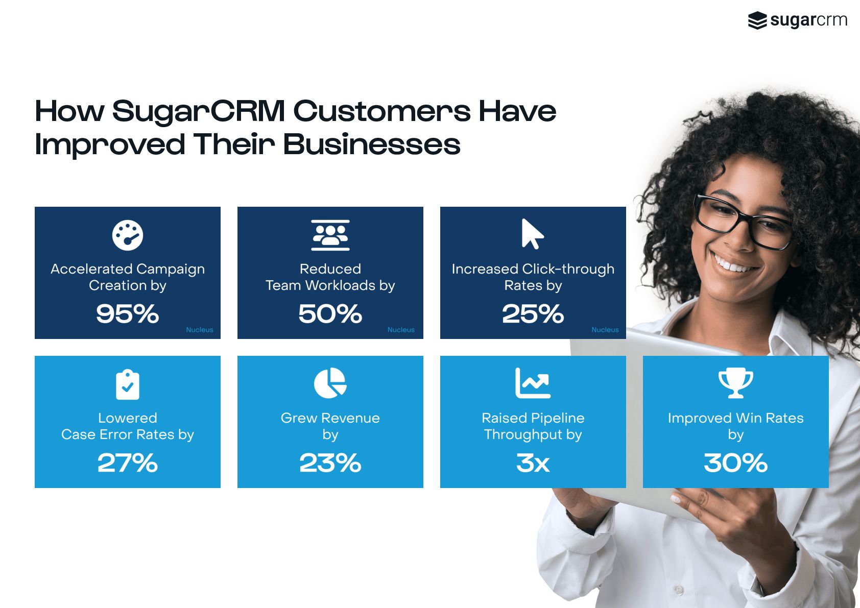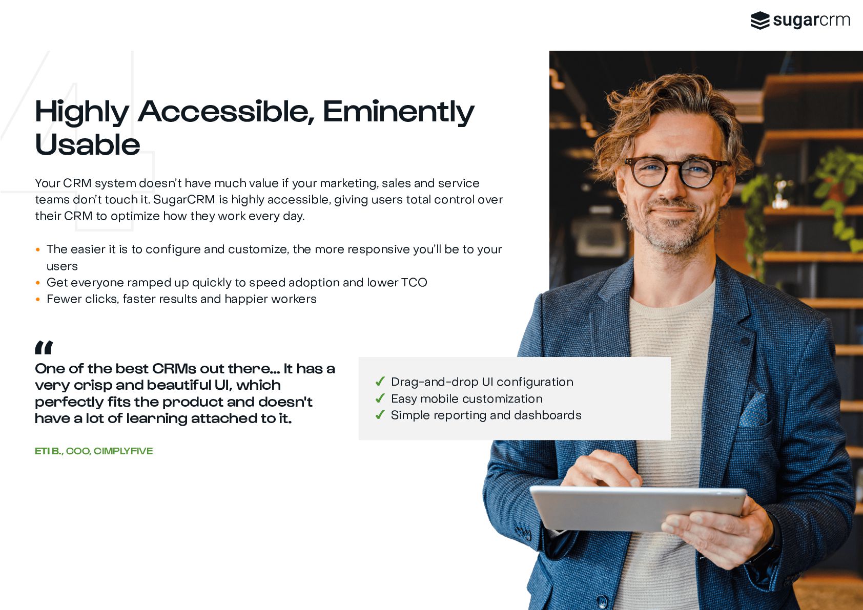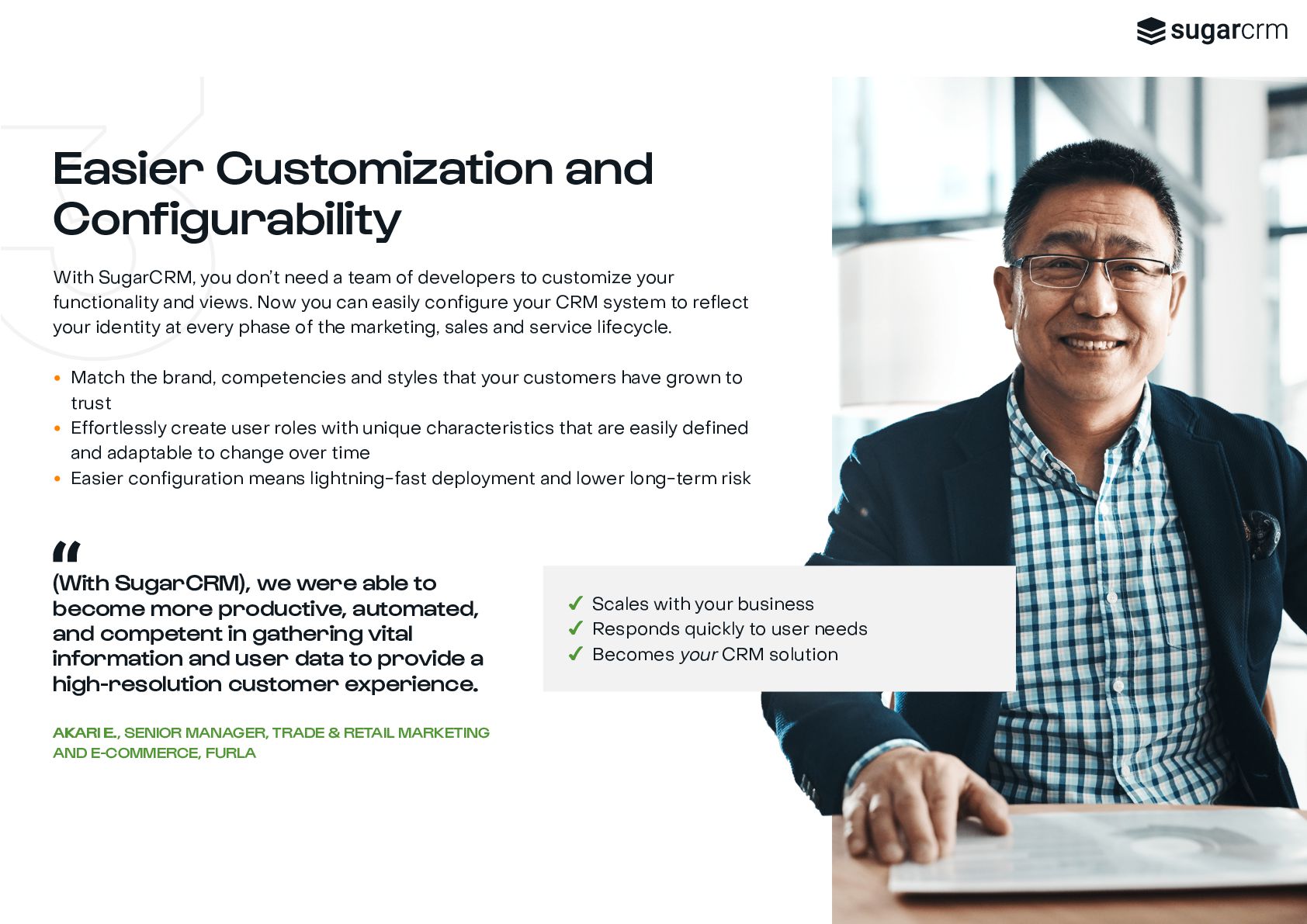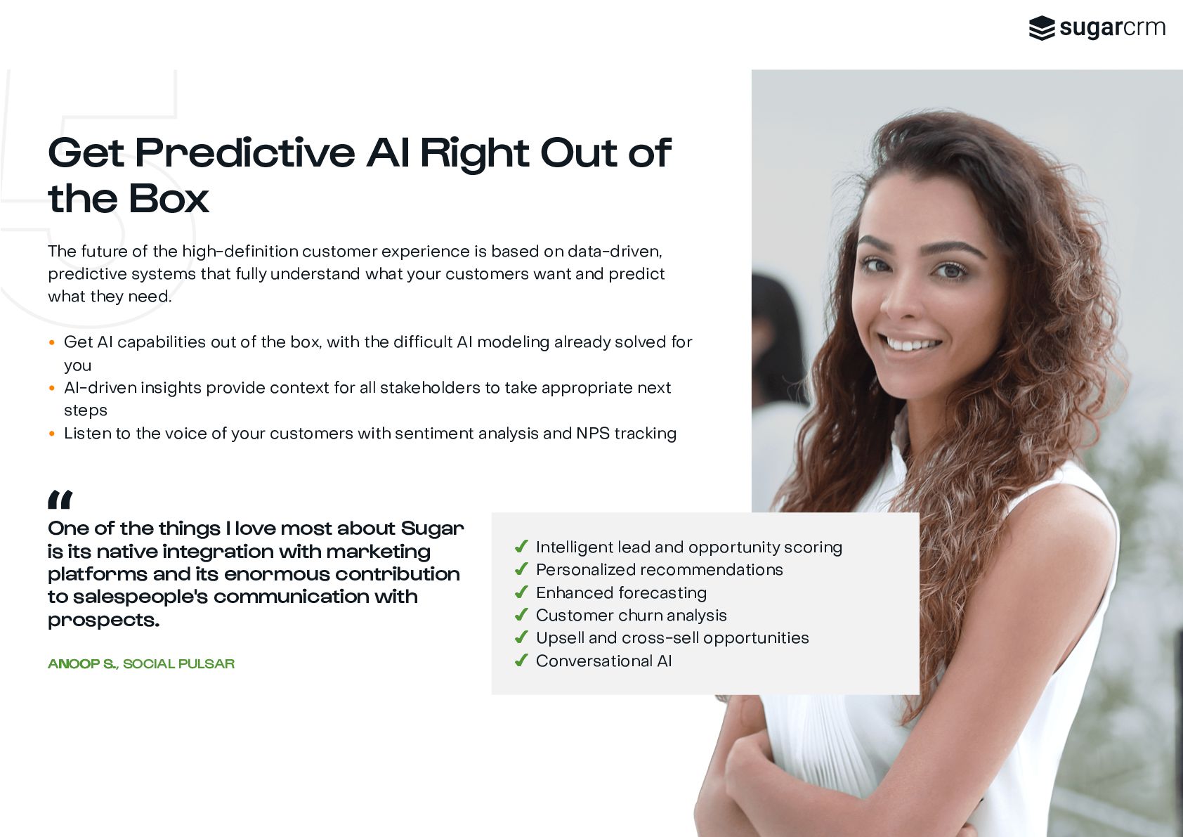 marketing, sales, and service teams are all working with the same data, and from the same playbook, you add intelligence to customer engagement across every touchpoint and create a seamless, high-definition customer experience. Sugar is a great system to manage leads and conversions so we can map our topline goal of growing revenue. J JA ASON M. SON M., VP OF SALES, MATERION It’s time to let the platform do the work for you ✔ No Blind Spots ✔ No Busy Work ✔ No Roadblocks Connect all stakeholders with complete real-time customer view View immediate status of every opportunity to know next steps and craft more personalized engagements Fit a powerful CRM platform into any infrastructure, connected to your critical third-party applications