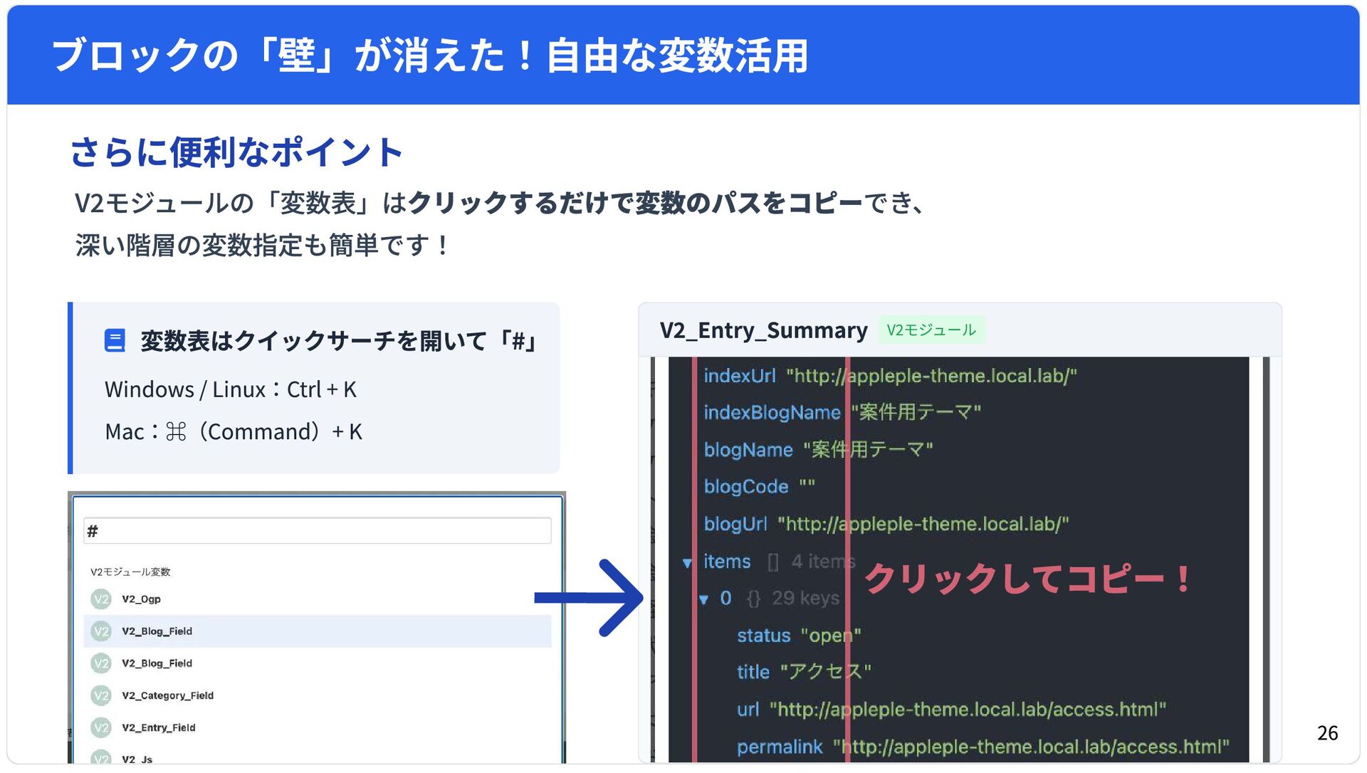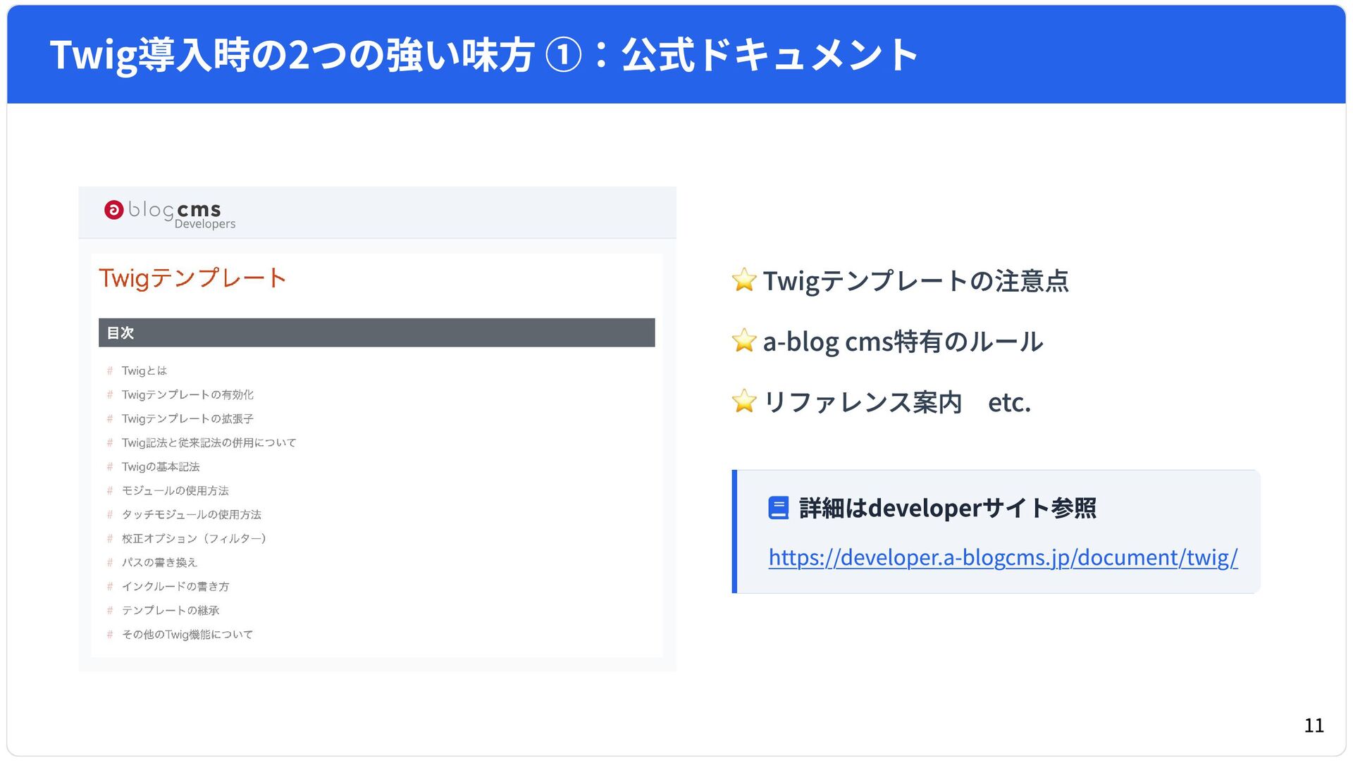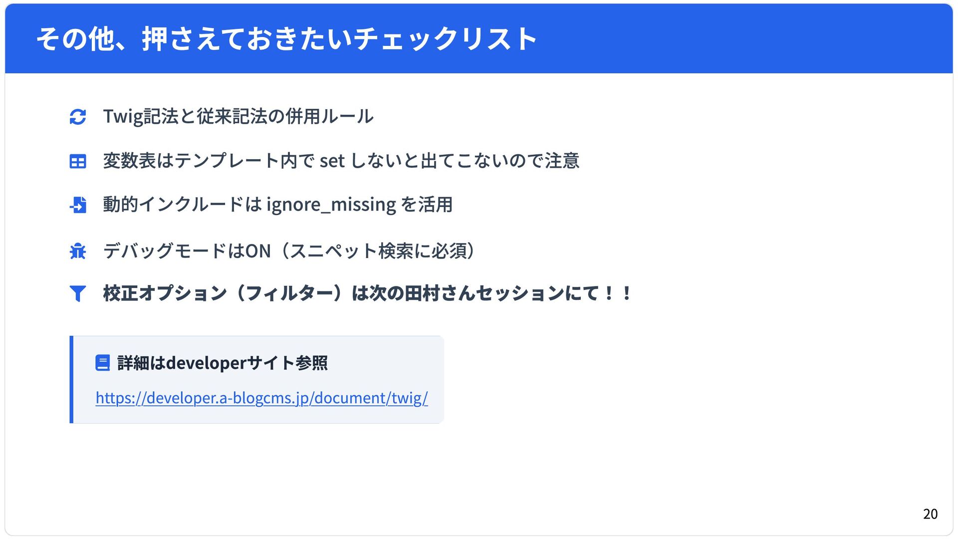 a-blog cms Ver. 3.2 より導入された「Twig記法」および「V2モジュール」。 本スライドは、従来のa-blog cms標準記法で制作された既存テーマを、実際にTwig化・V2モジュール化した際に、ここは気をつけた方がいいと感んじたポイントなどをピックアップしたセッション資料です。