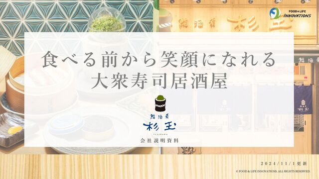 設 立 資 本 金 主 要 株 主 代 表 者 売 上 高 株 式 会 社 F O O D & L I F E I N N O V A T I O N S の 会 社 概 要 従 業 員 数 事 業 内 容 業 態 名 所 在 地 店 舗 数 設立 2015年10月 資本金 1千万円 主要株主 株式会社FOOD & LIFE COMPANIES 売上高 3,017億円(2023年9月現在/連結) 従業員数 社員:212名(2024年9月5日現在) 事業内容 飲食店の経営 業態名 鮨 酒 肴 杉玉 / むすび寿司 所在 〒100-0005 東京都千代田区丸の内2-1-1 明治生命館8F 代表者 代表取締役社長 堀江 陽