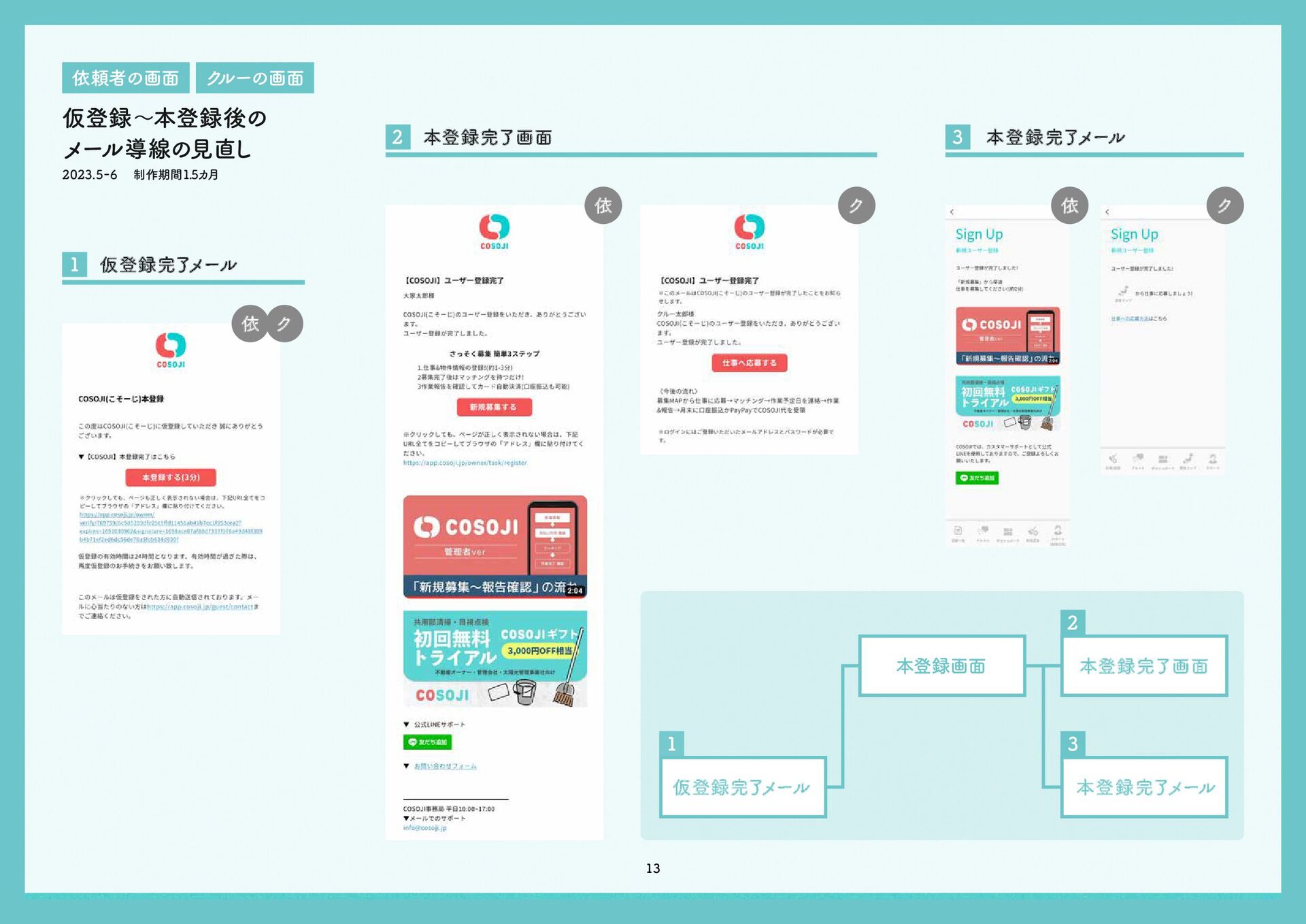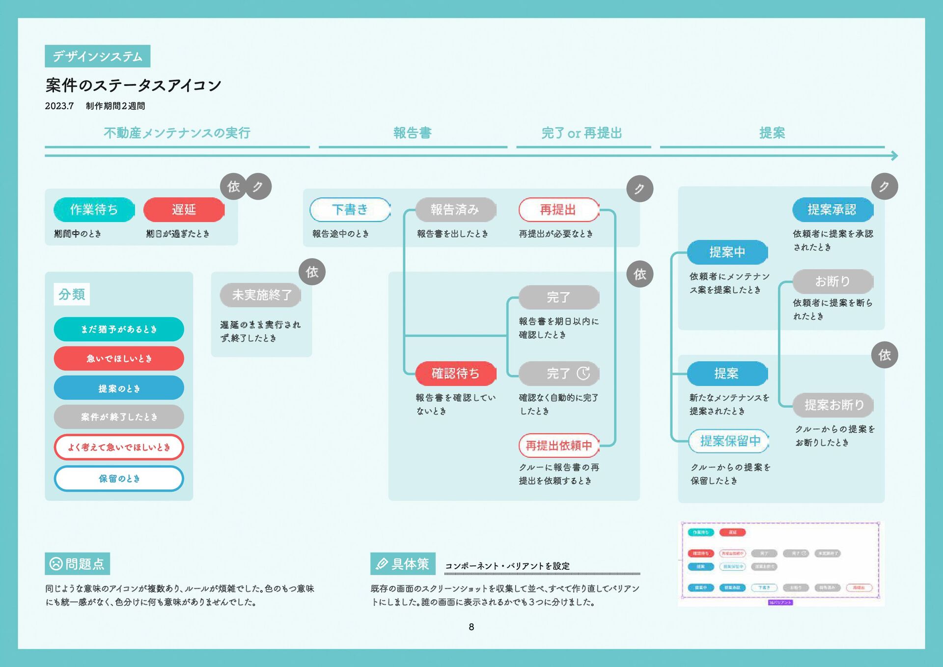 ク を 振 り 返 り やす く す る ク ルー に こ れ ま での案件に さ れ て き た フ ィ ー ド バ ッ ク が伝わ っ てい ない。 「残念だ っ た」 「注意 し てほ し い点」 があ る案件に特に注目 し て ほ し い。 気持ち・コメントでステータスバーの表示を変更 どんな機能なのか気づかせるためにア イ コ ンを用意しま した。 ページを開 いてから本文をすぐ読めるよ うに、 画像はカバーに設定しま した。 ステータスバーを押すと細かいコメントが読める 褒め言葉である 『感謝の コ メ ン ト 』 ・ お叱 り であ る 『次回注意 し てほ し い点』 を ポ ッ プア ッ プで読め ま す 。 依頼者の都合で ノ ー コ メ ン トの場合も あ り ま す 。 良かった 良かった +注意 残念だった +注意 残念だった 再提出後に 確認完了 評価な し +感謝OR注意 ア イ コンの種類 問題点 具体策 2023.5-6 制作期間2カ 月