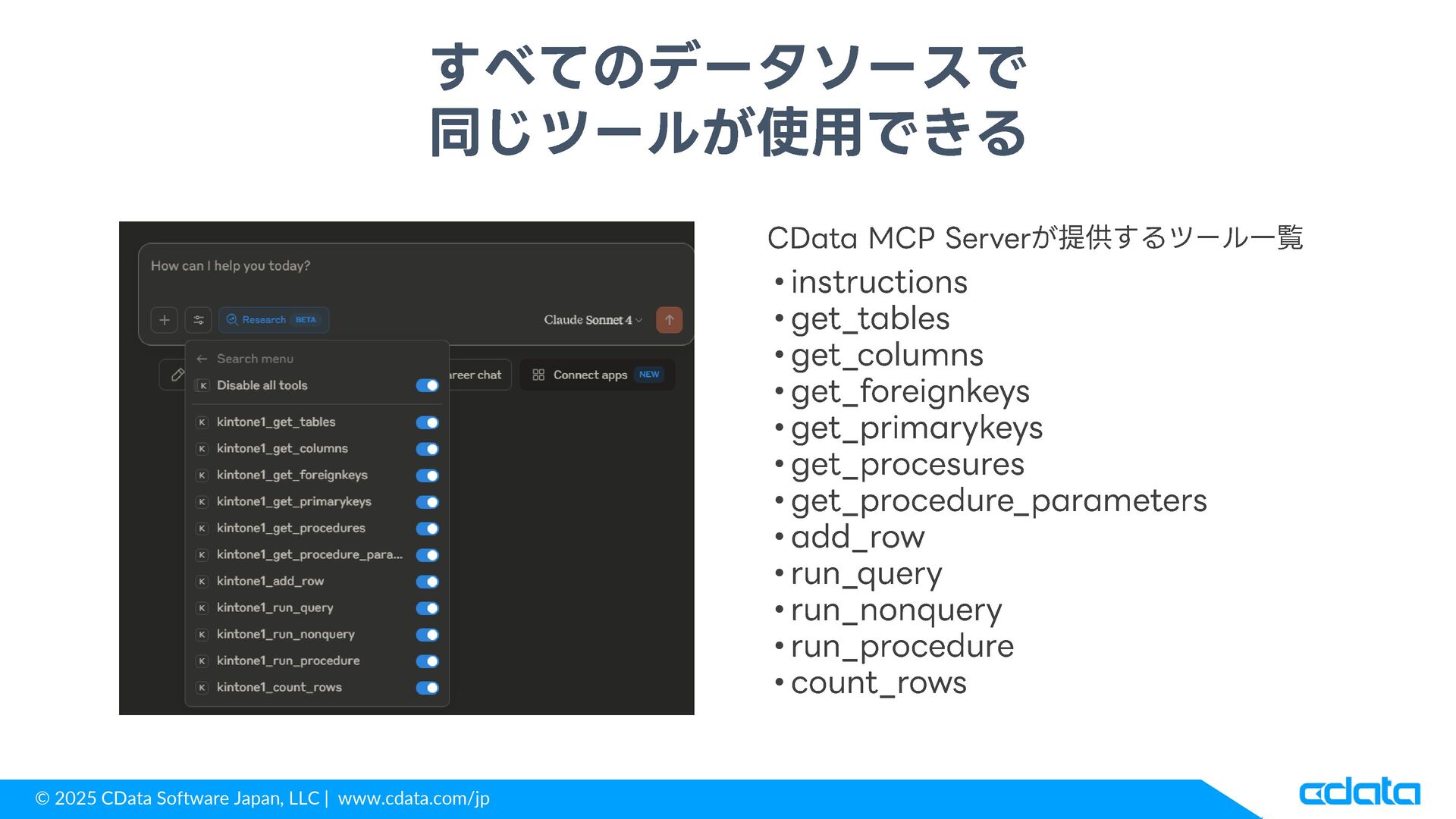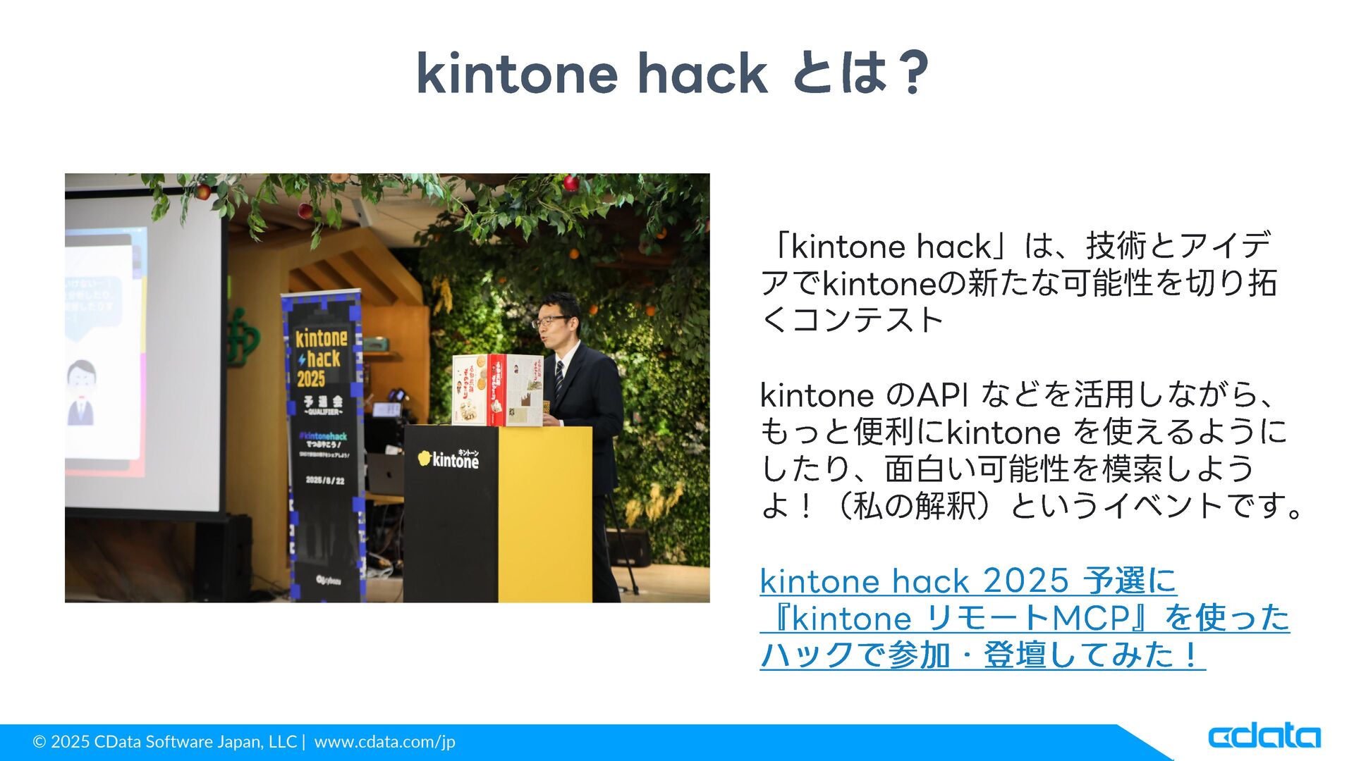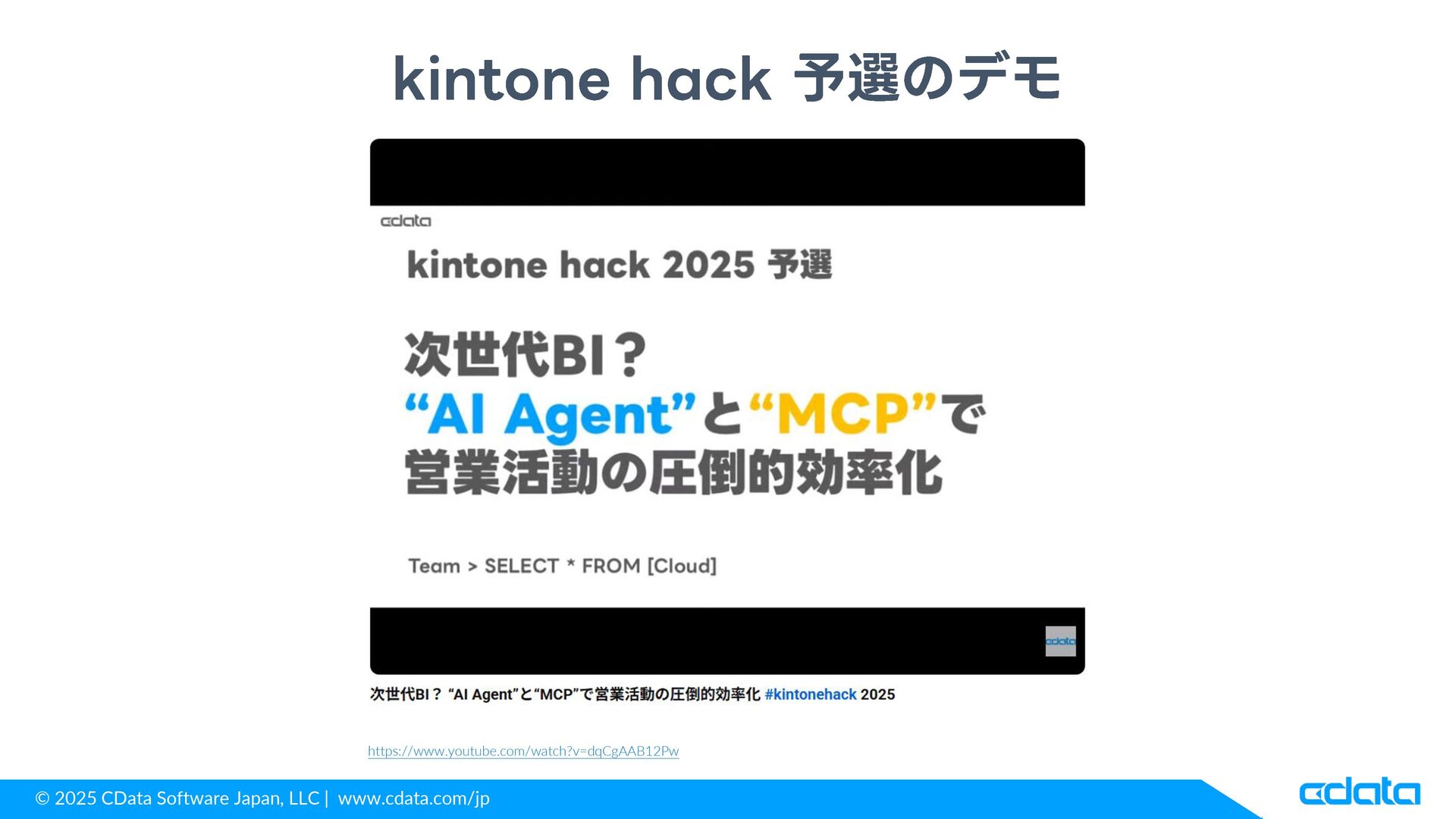 BIの本質は「インサイト」と「ネクストアクション」にあります。従来のBIツールは専門知識が必要で敷居が高かったものの、kintoneとMCP の組み合わせにより、AIエージェントが一気通貫のデータ分析とネクストアクション自動化を実現しました。 今回のセッションではkintone hack での発表内容に基づきながら、登壇ではお話しきれなかったリモートMCP とkintone・Claude の使い方・利用ポイントを詳しく解説します。