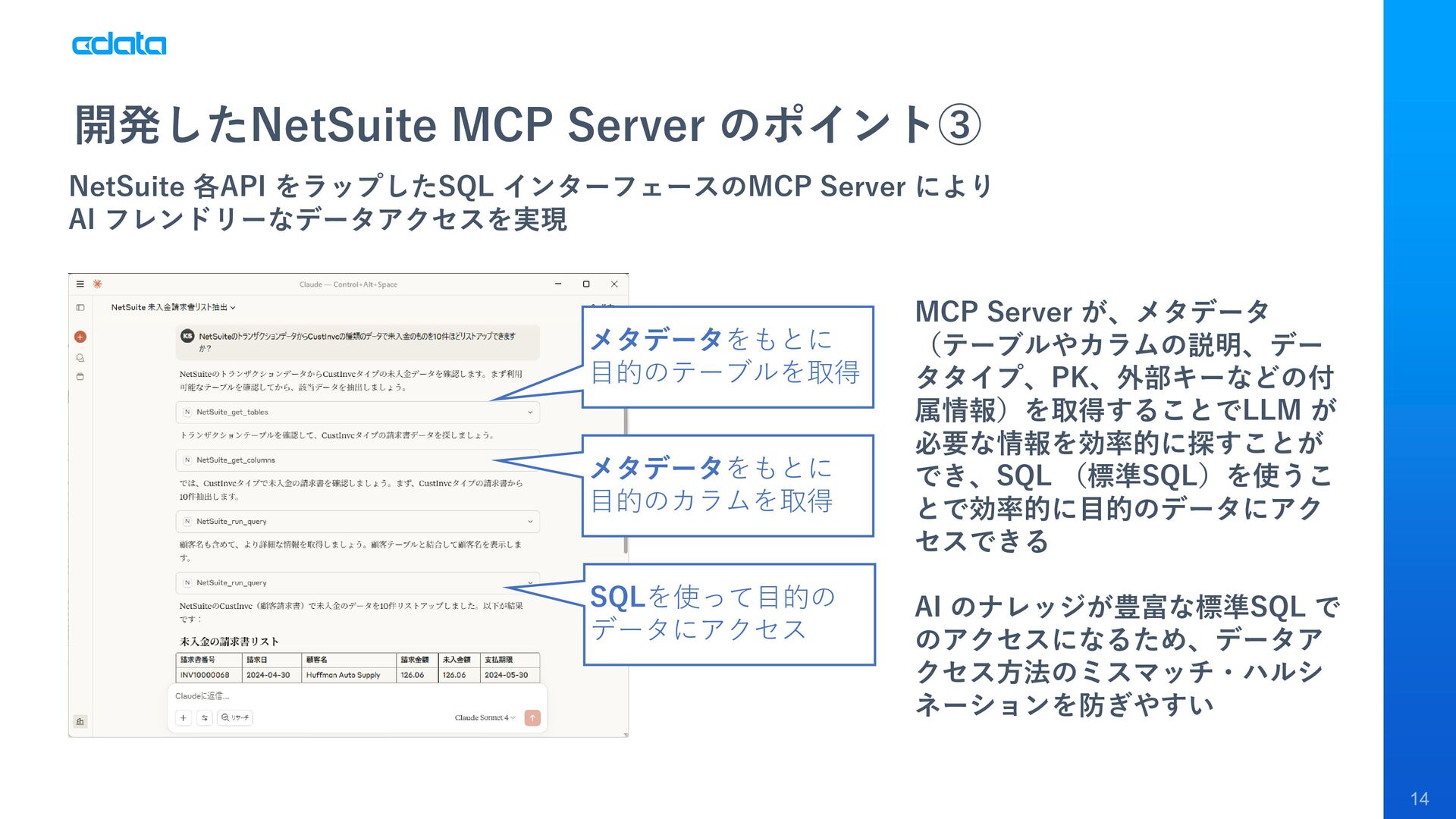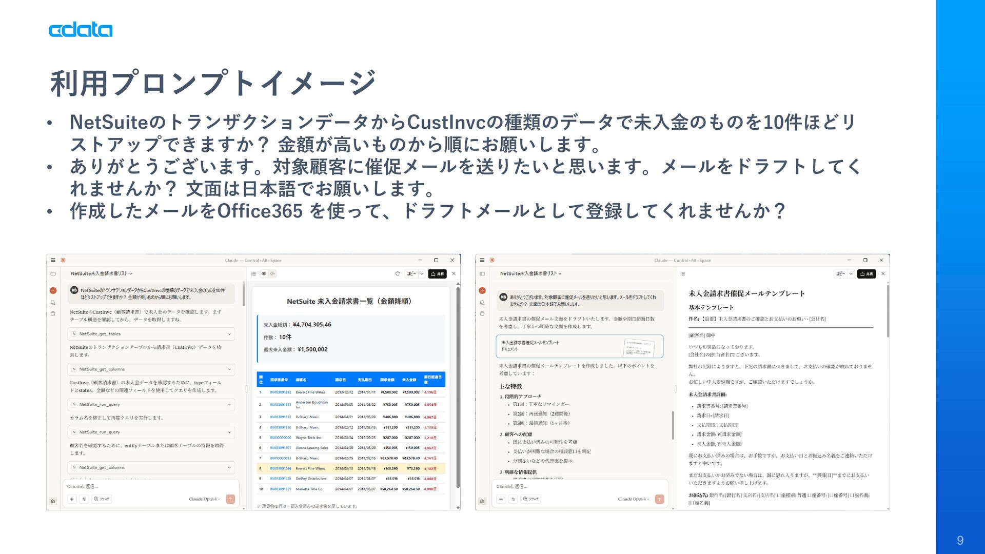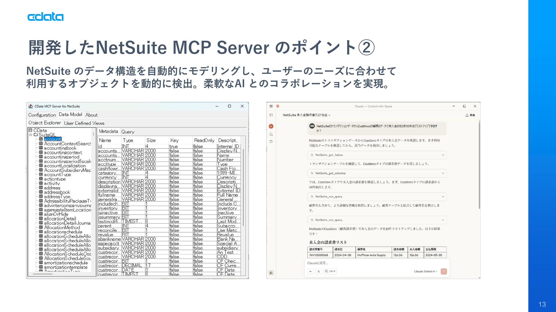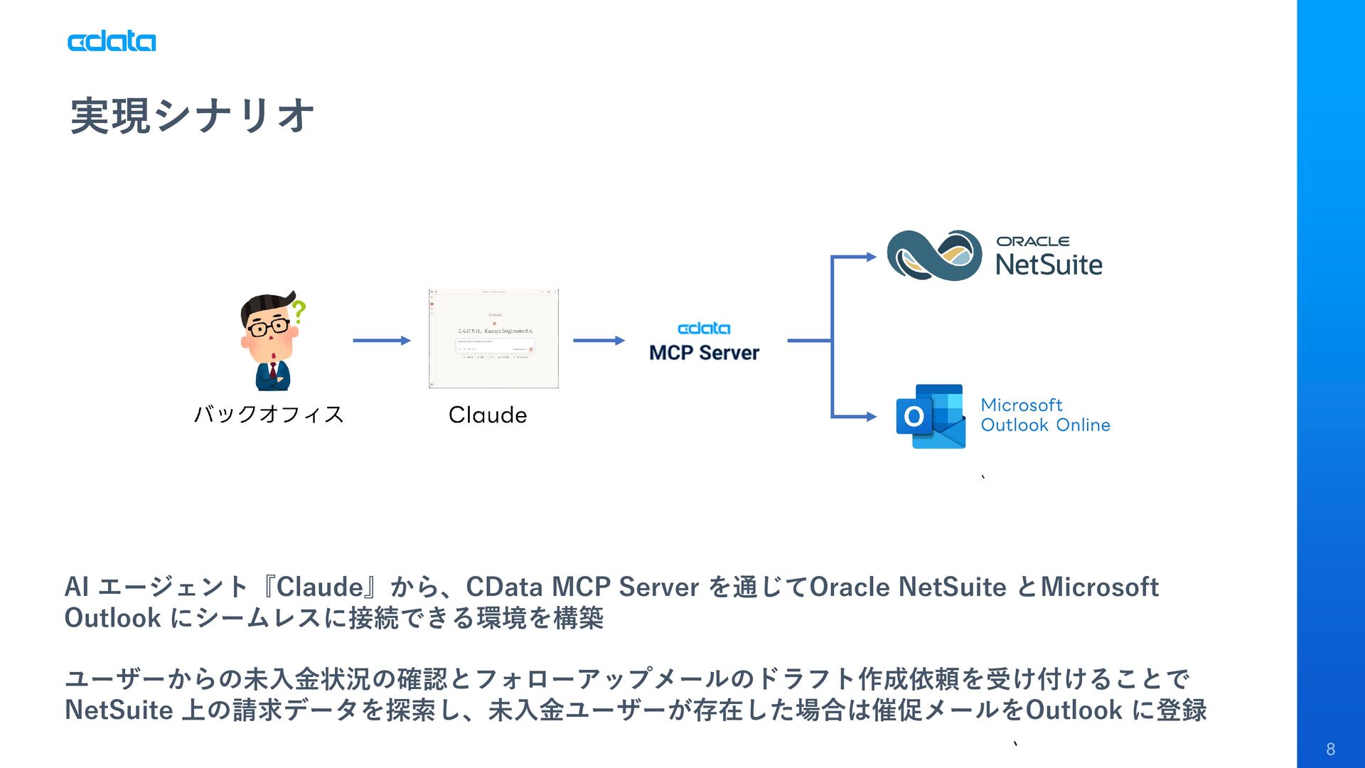 NetSuite のMCP(Model Context Protocol)Server を基盤とし、AI エージェント「Claude」と連携することで、未入金管理業務の最適化を目指しました。CData のAPI 連携のテクノロジーとMCP を活用し、NetSuite データをリアルタイムで外部システムと接続。AI が未入金アラートの自動通知や対応ステータス管理を行うなど、回収業務の効率化とミスの削減に寄与しています。