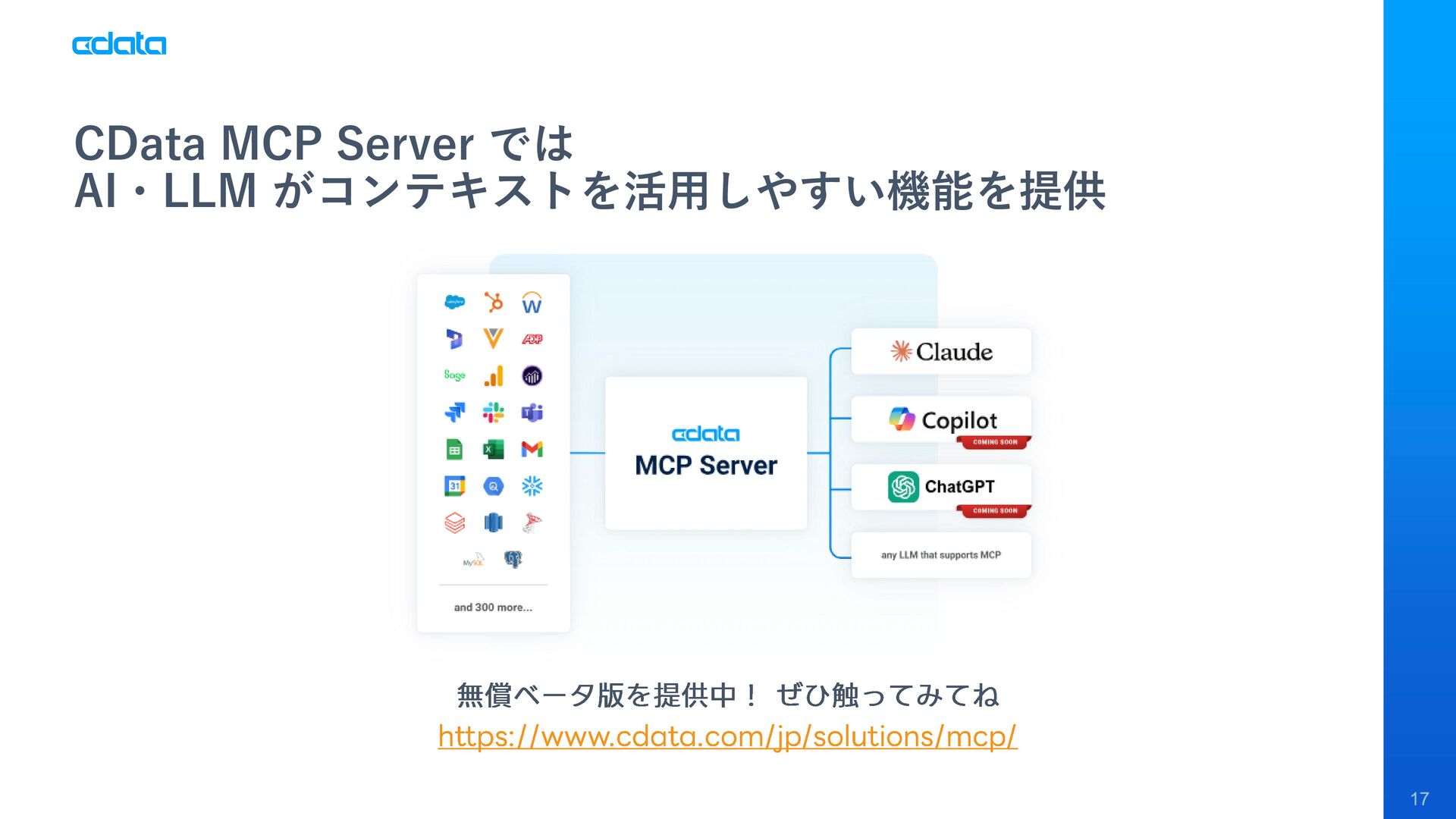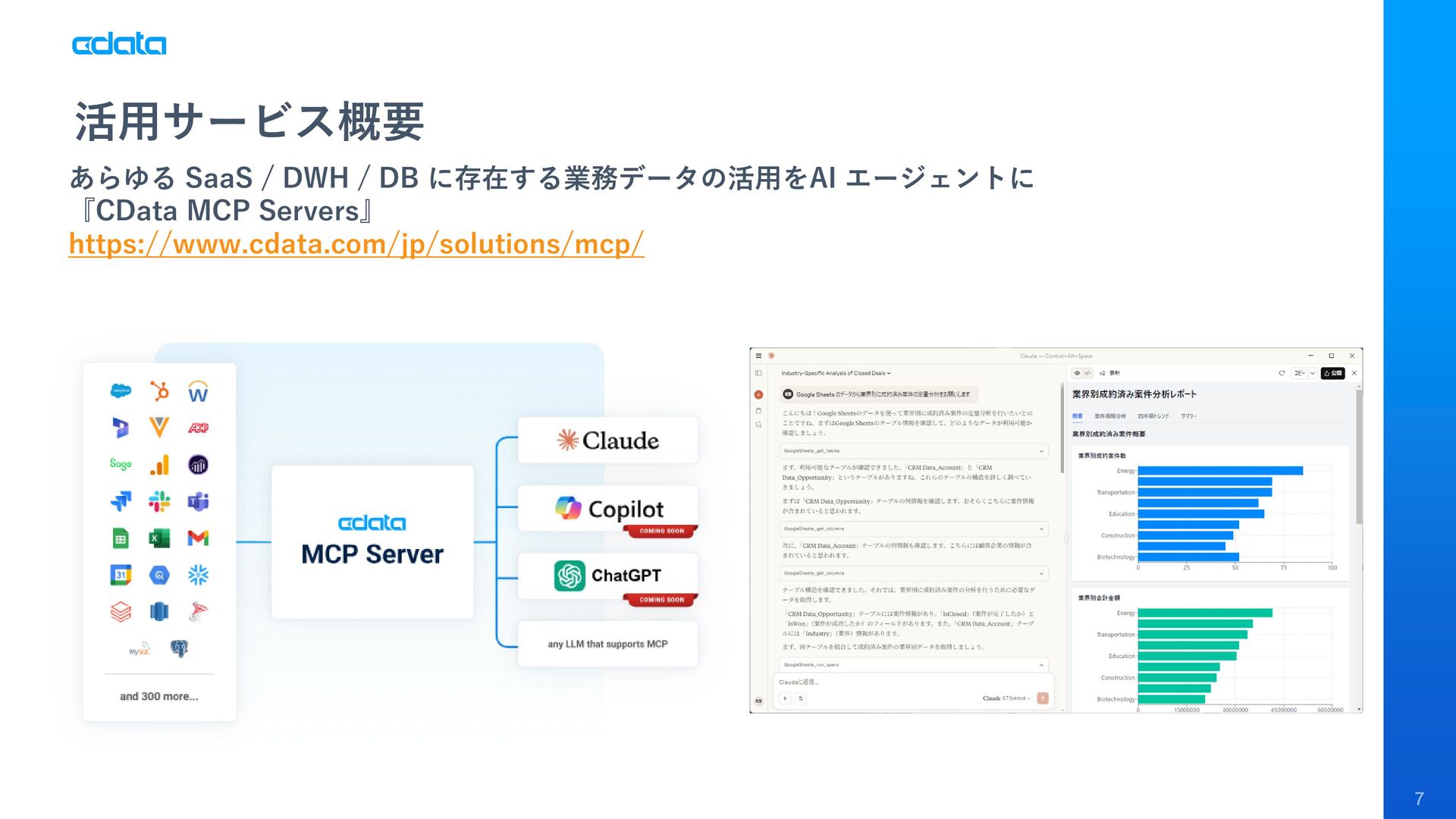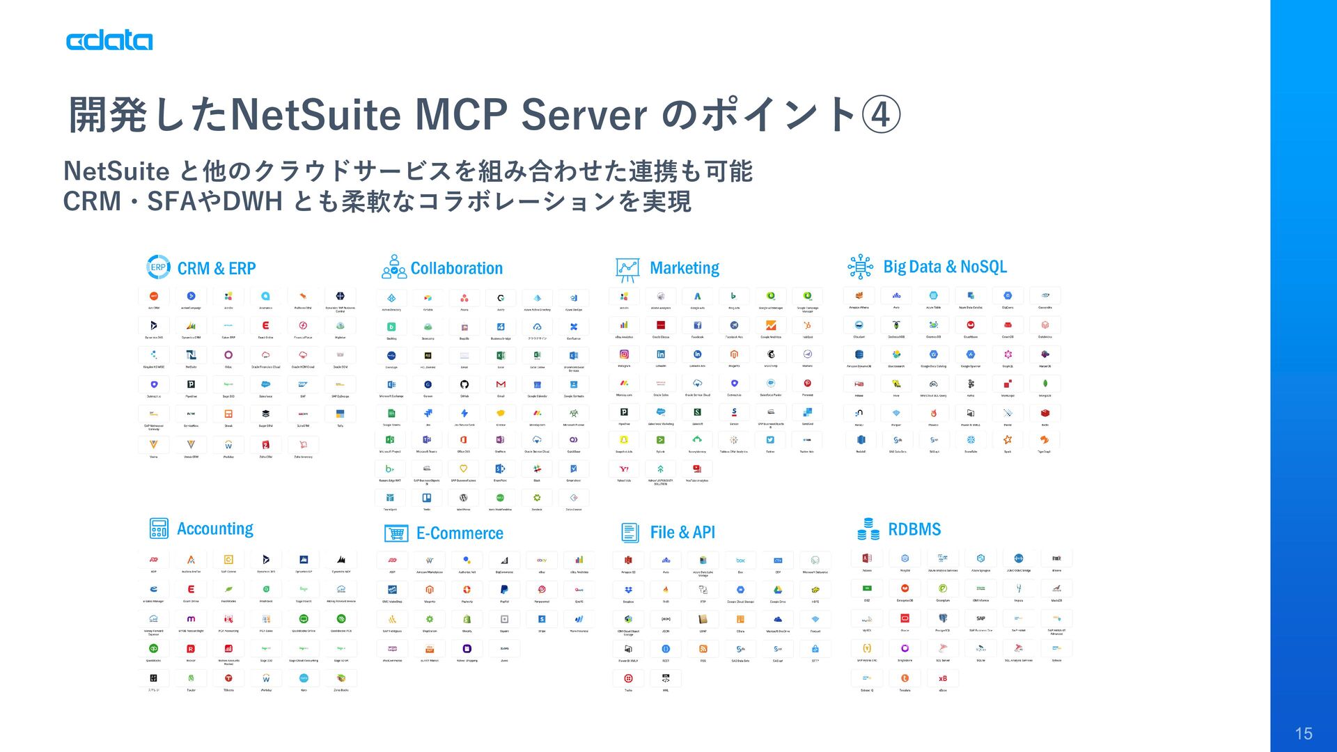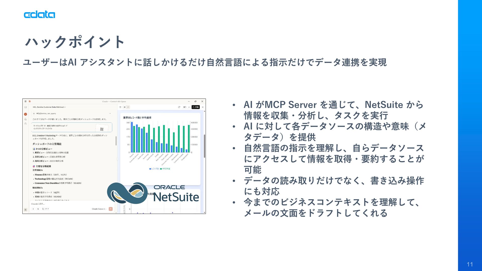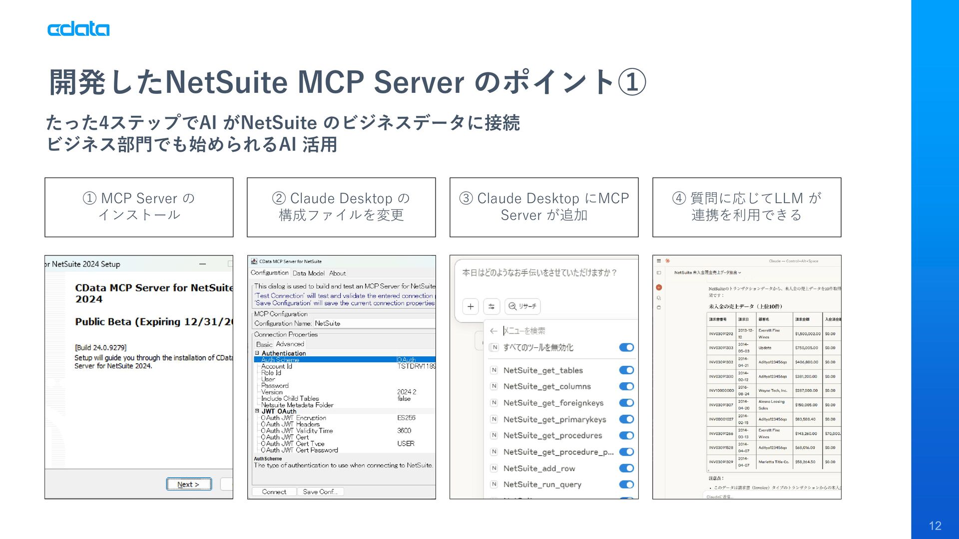 NetSuite のMCP(Model Context Protocol)Server を基盤とし、AI エージェント「Claude」と連携することで、未入金管理業務の最適化を目指しました。CData のAPI 連携のテクノロジーとMCP を活用し、NetSuite データをリアルタイムで外部システムと接続。AI が未入金アラートの自動通知や対応ステータス管理を行うなど、回収業務の効率化とミスの削減に寄与しています。