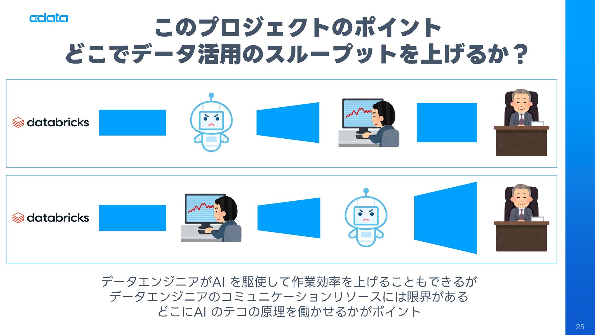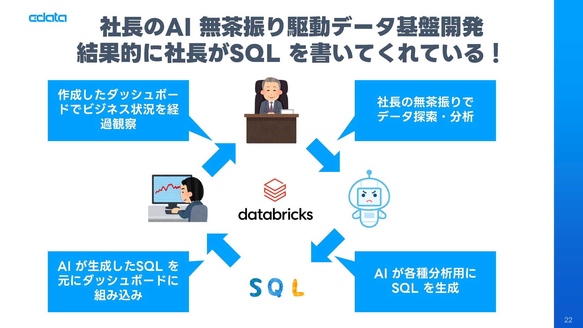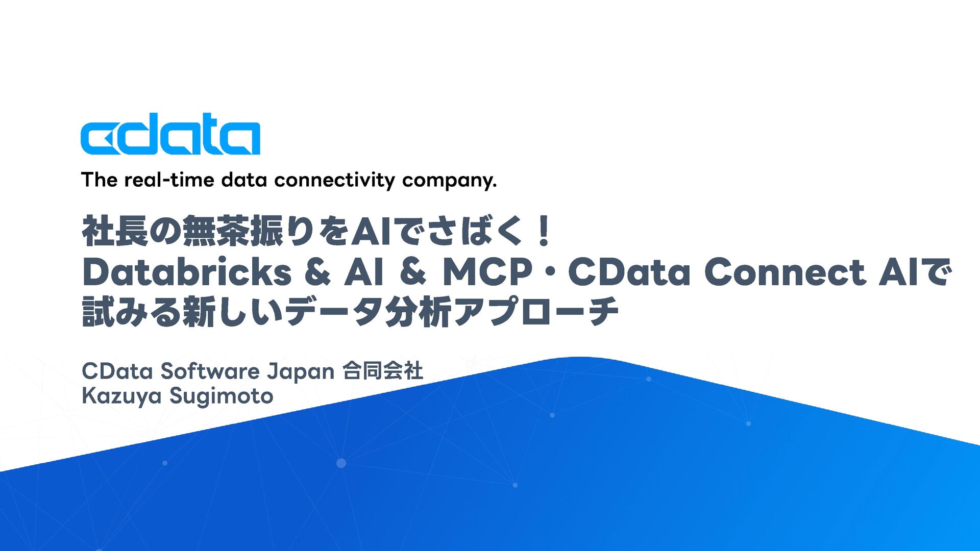 社長やビジネスユーザーからの「このデータが見たい」「こんな分析がしたい」という無茶振りリクエストに追われるデータエンジニアや経営企画室の皆様へ。ダッシュボードを作っても「この角度で見れないの?」「なんでこんなに時間がかかるの?」という声に悩まされていませんか? 本セッションでは、AIとMCP 、そしてDWH・Databricksを組み合わせた「社長のAI無茶振り駆動データ基盤開発」という新しいアプローチを紹介します。