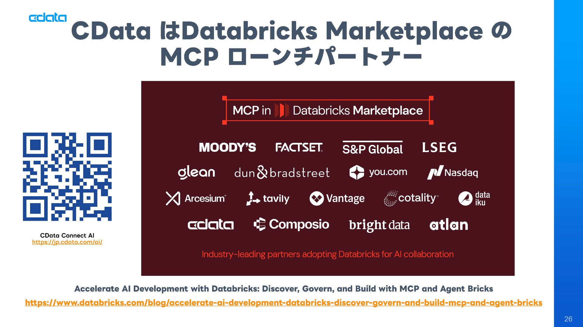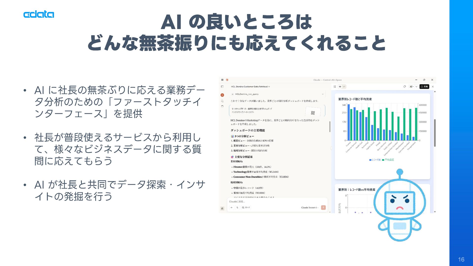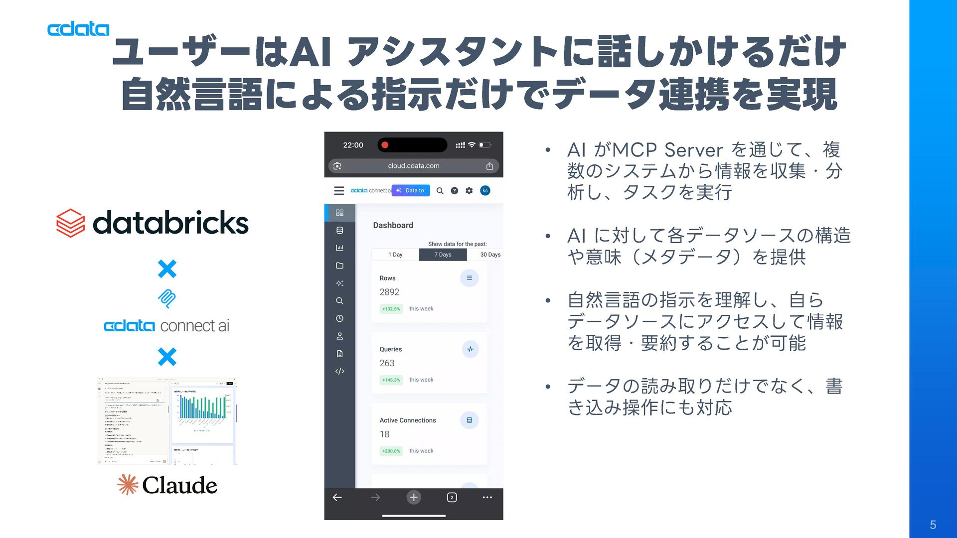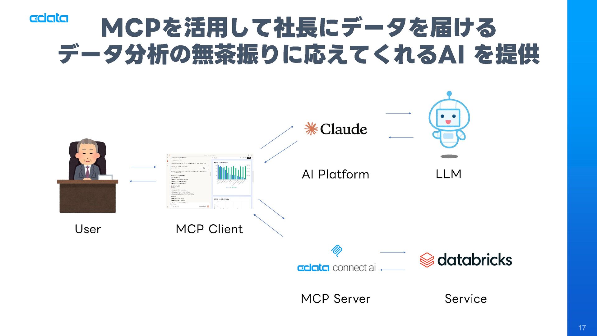 ビジネスユーザーが普段使うAIアシスタントからMCP経由でDWH上のデータを探索、SQL生成によるデータアクセスおよび分析・インサイトの獲得を実現。従来のBIツールやダッシュボード開発との比較、AIのデータ分析品質を高めるポイント、そしてこのアプローチがデータエンジニアの業務をどう変えるのかを解説します。