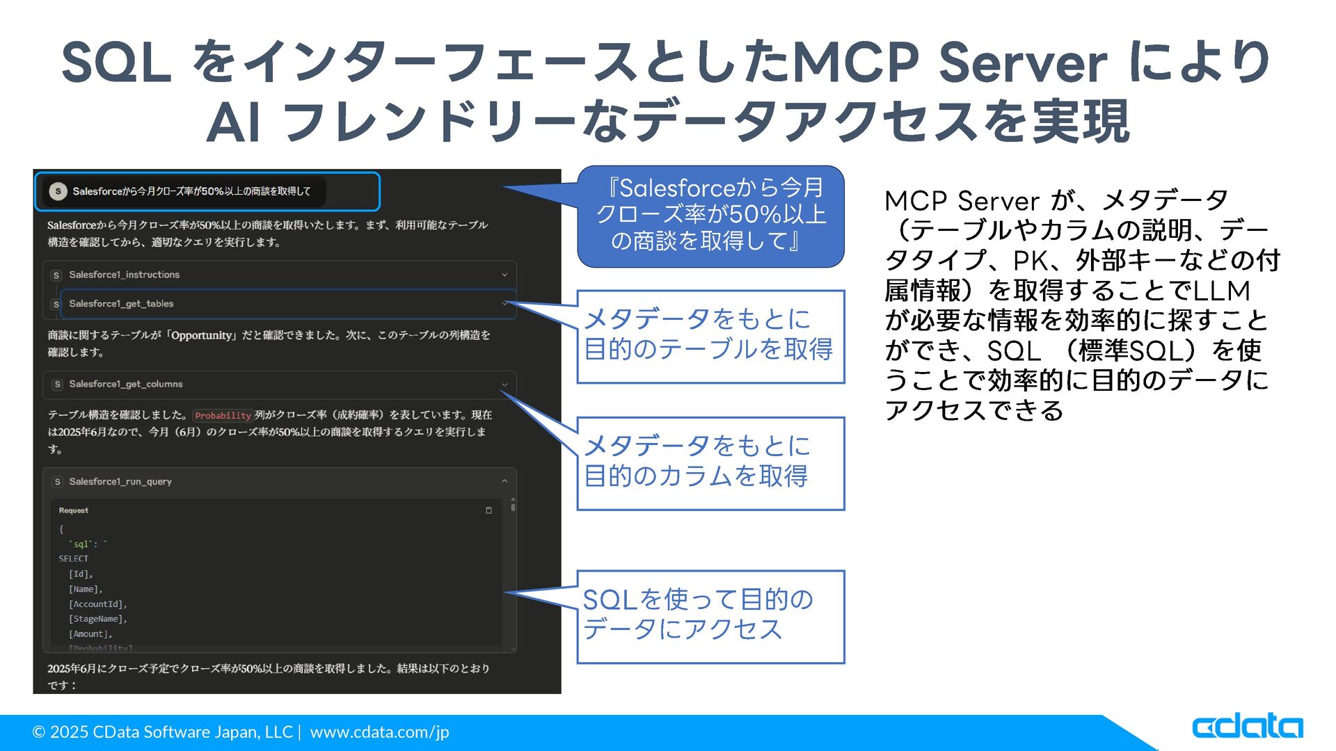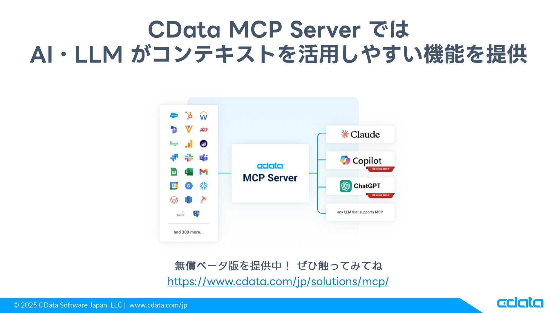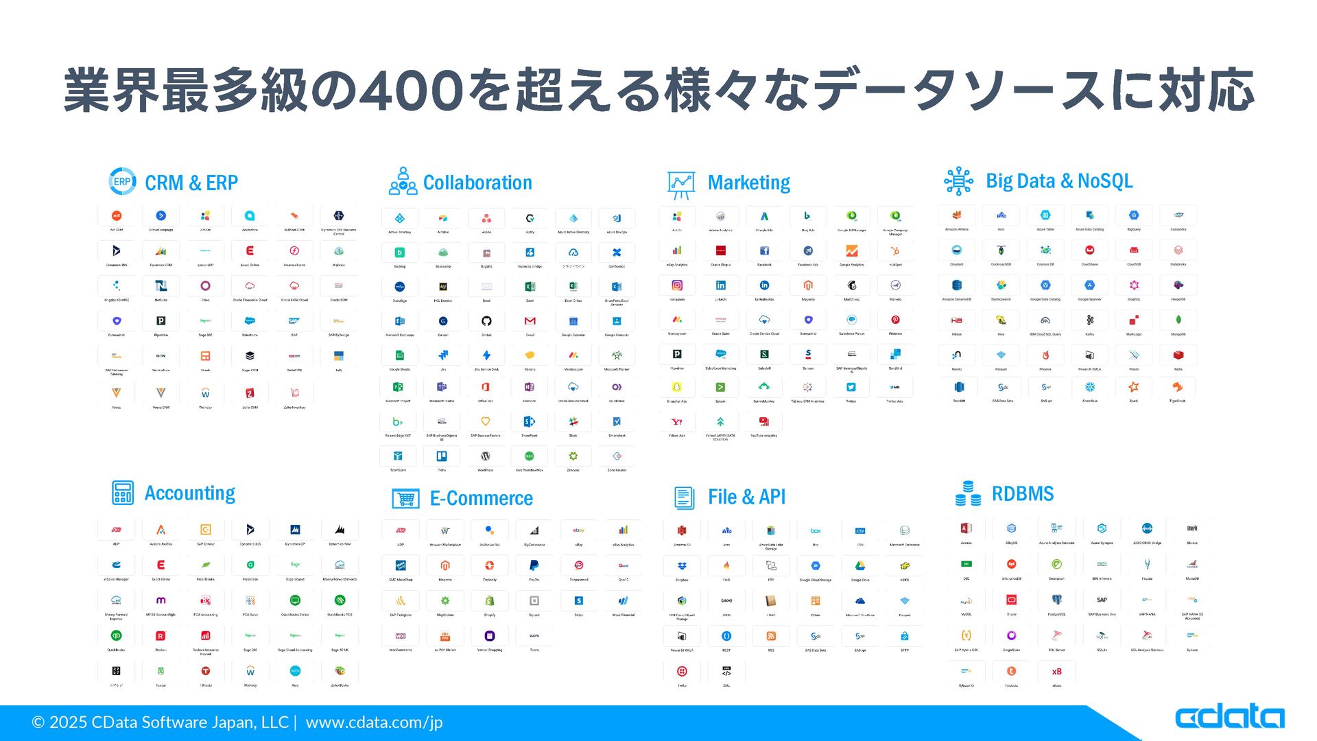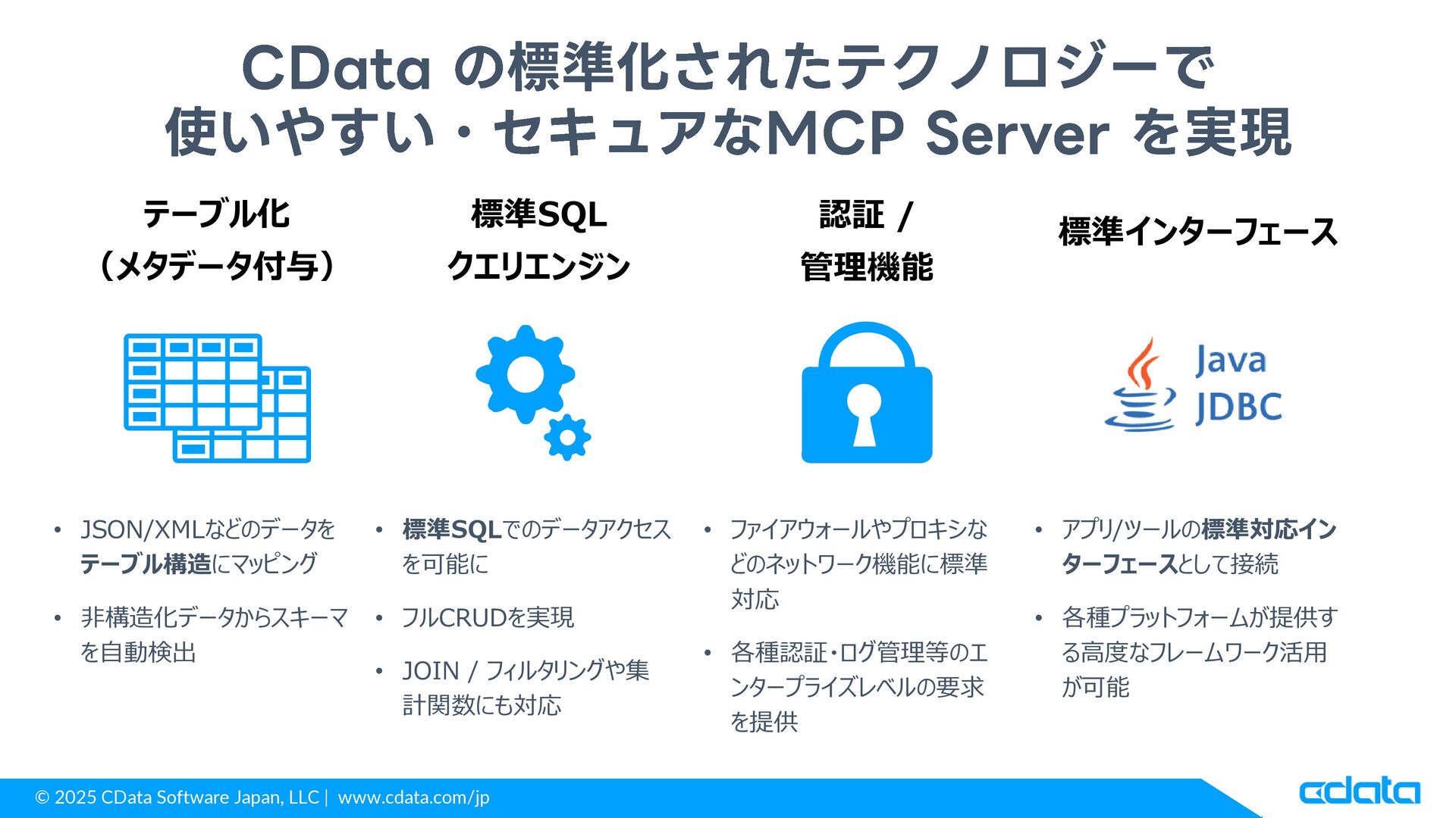 テーブル構造にマッピング • 非構造化データからスキーマ を自動検出 • 標準SQLでのデータアクセス を可能に • フルCRUDを実現 • JOIN / フィルタリングや集 計関数にも対応 • アプリ/ツールの標準対応イン ターフェースとして接続 • 各種プラットフォームが提供す る高度なフレームワーク活用 が可能 • ファイアウォールやプロキシな どのネットワーク機能に標準 対応 • 各種認証・ログ管理等のエ ンタープライズレベルの要求 を提供 テーブル化 (メタデータ付与) 標準SQL クエリエンジン 標準インターフェース 認証 / 管理機能