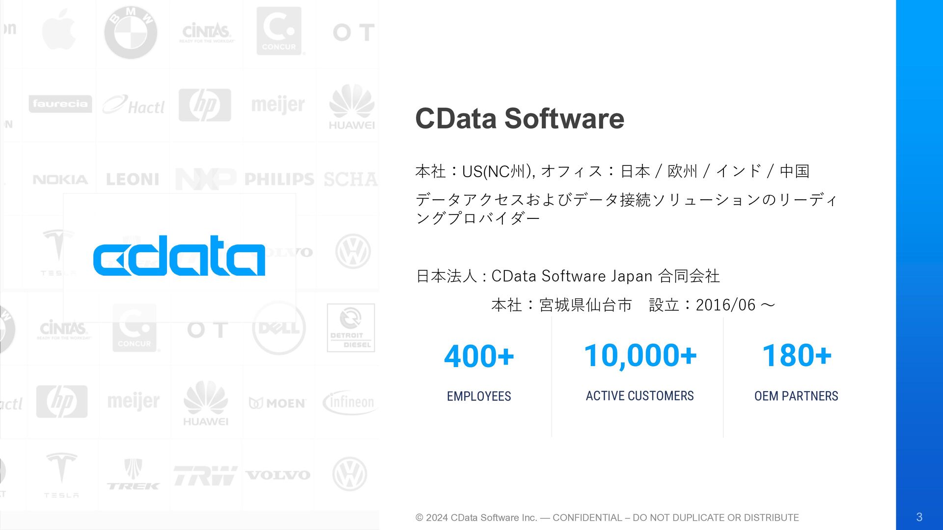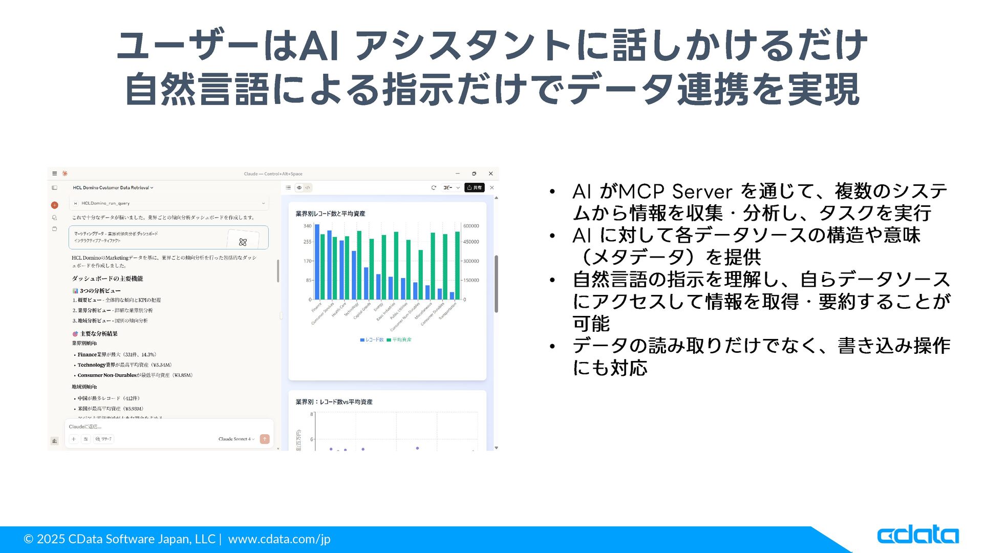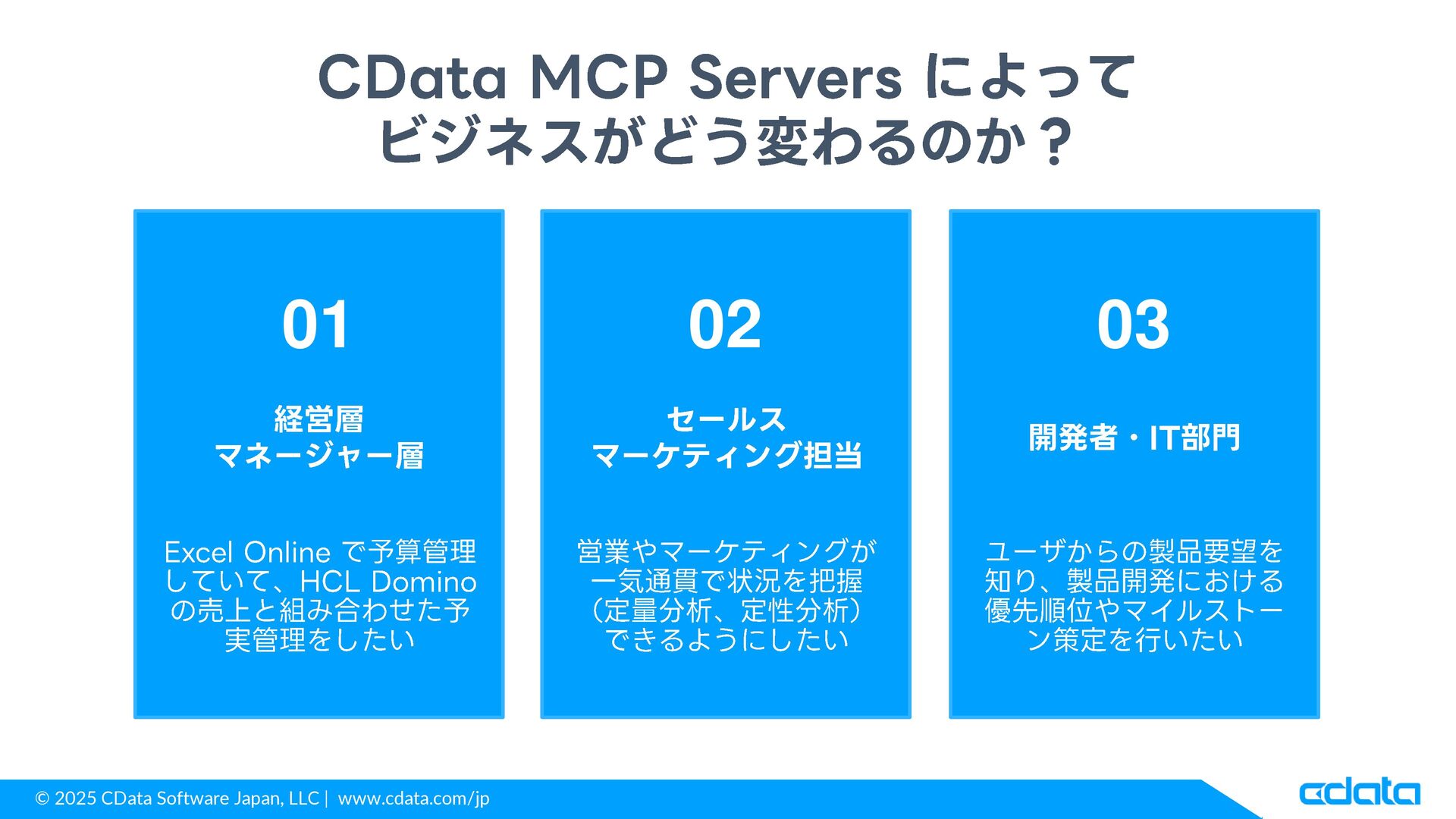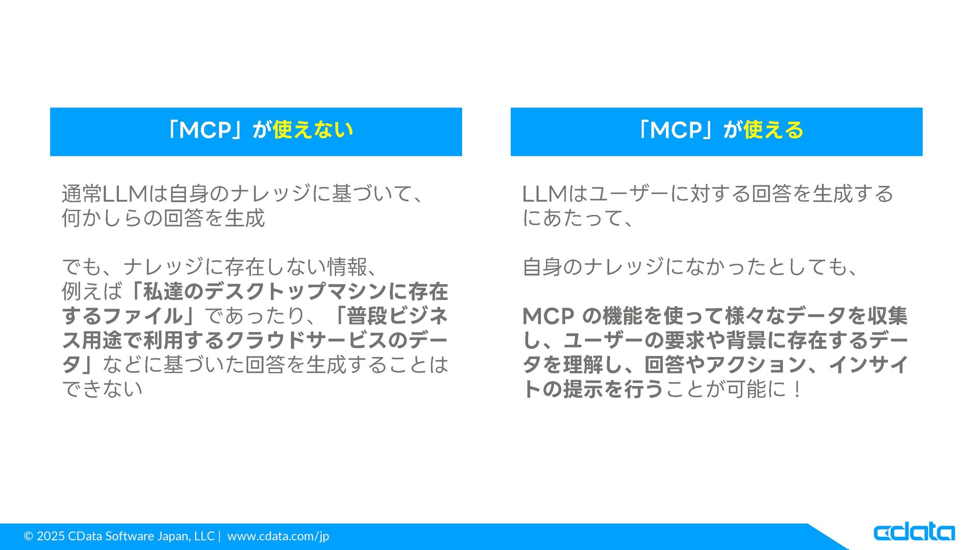 テーブル構造にマッピング • 非構造化データからスキーマ を自動検出 • 標準SQLでのデータアクセス を可能に • フルCRUDを実現 • JOIN / フィルタリングや集 計関数にも対応 • アプリ/ツールの標準対応イン ターフェースとして接続 • 各種プラットフォームが提供す る高度なフレームワーク活用 が可能 • ファイアウォールやプロキシな どのネットワーク機能に標準 対応 • 各種認証・ログ管理等のエ ンタープライズレベルの要求 を提供 テーブル化 (メタデータ付与) 標準SQL クエリエンジン 標準インターフェース 認証 / 管理機能