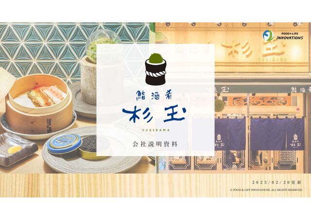 設 立 資 本 金 主 要 株 主 代 表 者 売 上 高 2015年10月 1千万円 株式会社FOOD & LIFE COMPANIES 100% 代表取締役社⾧ 山邉 圭介 2,813億円(2022年9月現在・連結) 【社員】85名 【パート・アルバイト】822名 (2021年9月30日現在) ※パート・アルバイトの人数は、1日8時間で換算した年間の平均人員となります。 飲食店の経営 鮨・酒・肴杉玉 むすび寿司 〒100-0005 東京都千代田区丸の内2-1-1 明治生命館 8F 電話 本社:03-6270-6613(代) 杉玉:68店舗[国内:67店舗 海外:1店舗] むすび寿司:1店舗 (2022年9月30日現在) 株 式 会 社 F O O D & L I F E I N N OVAT I O N S の 会 社 概 要 従 業 員 数 事 業 内 容 業 態 名 所 在 地 店 舗 数