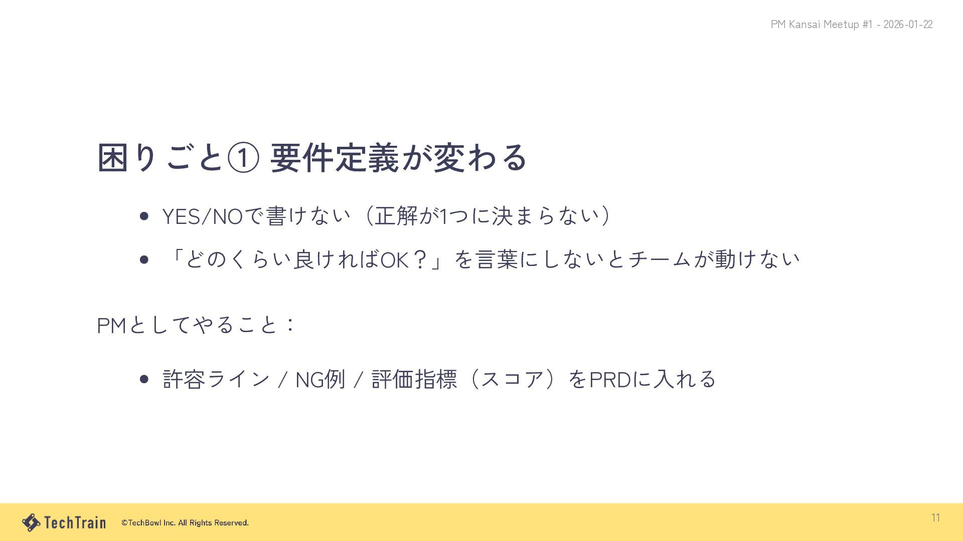 困りごと① 要件定義が変わる YES/NOで書けない(正解が1つに決まらない) 「どのくらい良ければOK?」を言葉にしないとチームが動けない PMとしてやること: 許容ライン / NG例 / 評価指標(スコア)をPRDに入れる