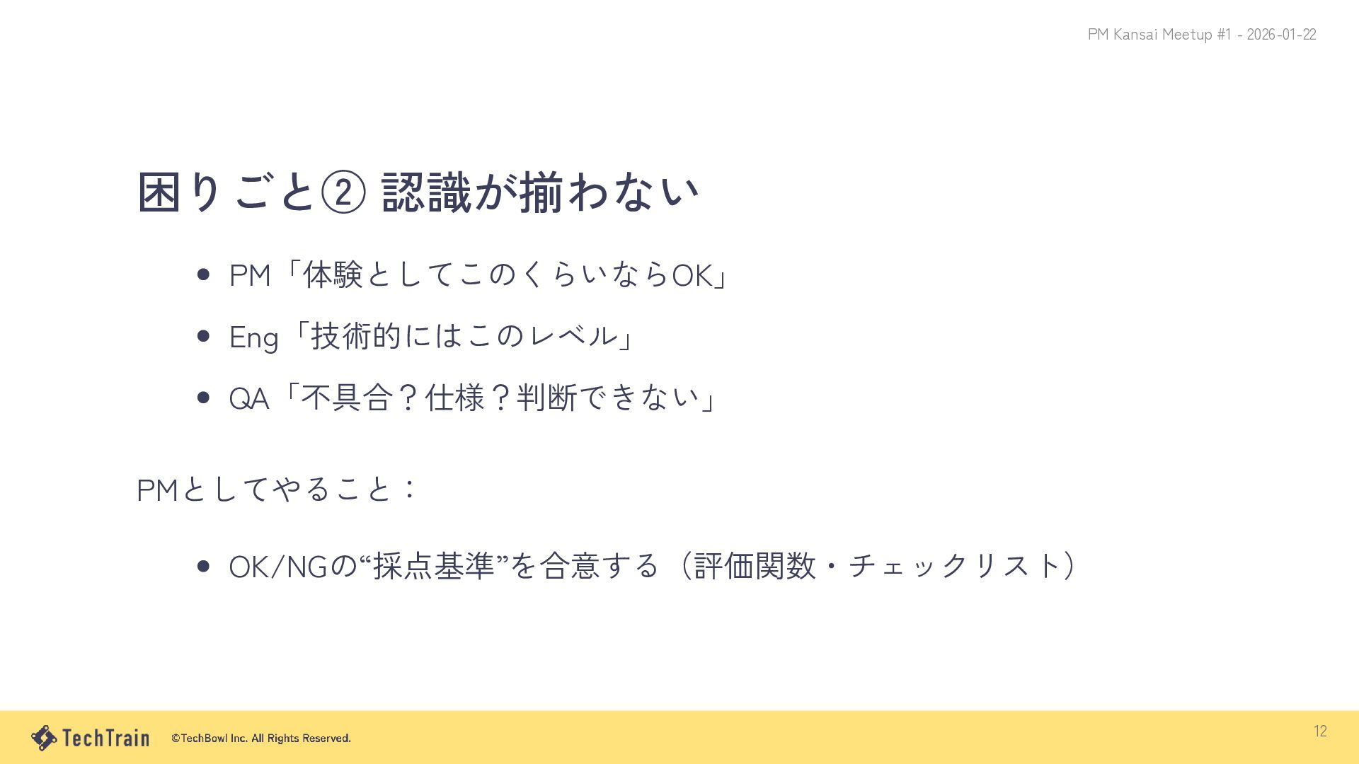 困りごと② 認識が揃わない PM「体験としてこのくらいならOK」 Eng「技術的にはこのレベル」 QA「不具合?仕様?判断できない」 PMとしてやること: OK/NGの“採点基準”を合意する(評価関数・チェックリスト) PM Kansai Meetup