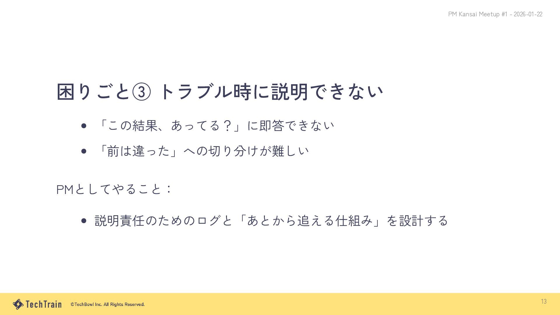 困りごと③ トラブル時に説明できない 「この結果、あってる?」に即答できない 「前は違った」への切り分けが難しい PMとしてやること: 説明責任のためのログと「あとから追える仕組み」を設計する PM Kansai Meetup #1