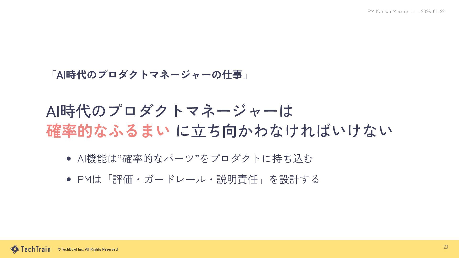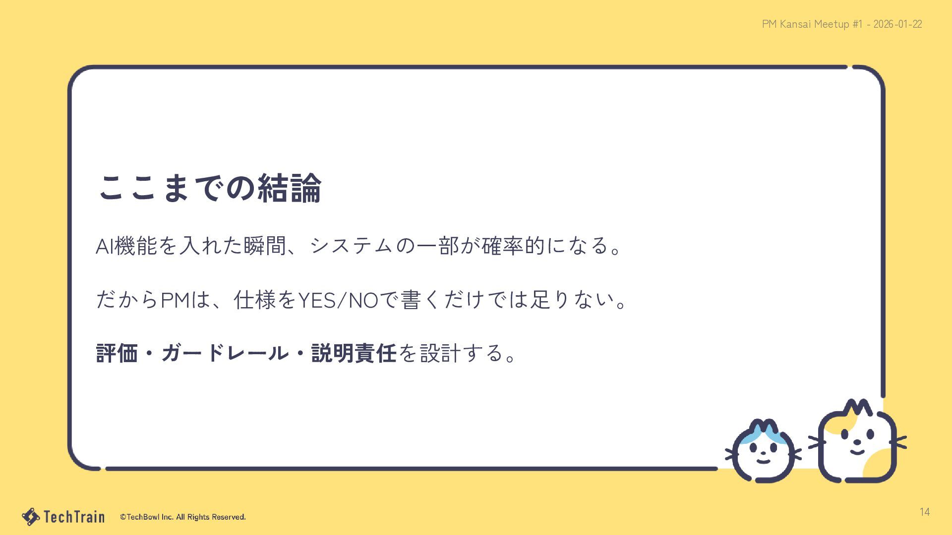 ここまでの結論 AI機能を入れた瞬間、システムの一部が確率的になる。 だからPMは、仕様をYES/NOで書くだけでは足りない。 評価・ガードレール・説明責任を設計する。 PM Kansai Meetup #1 - 2026-01-22