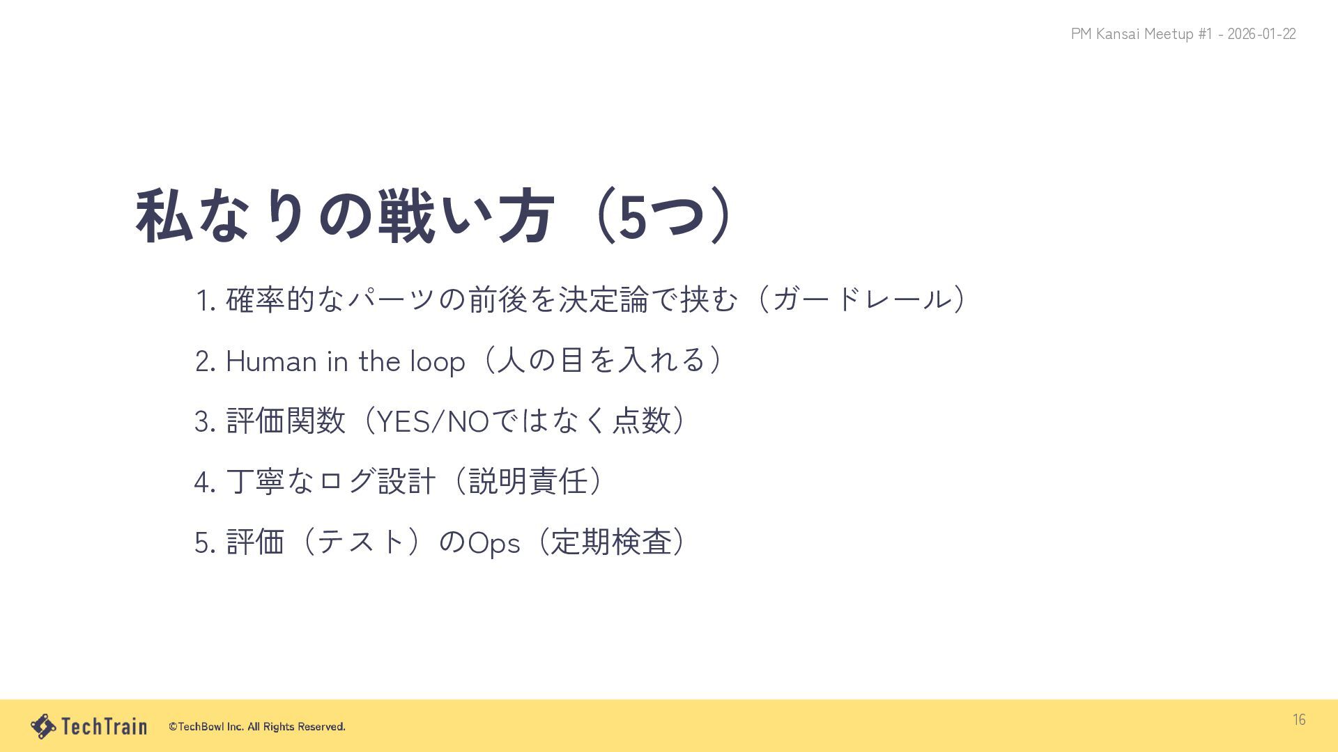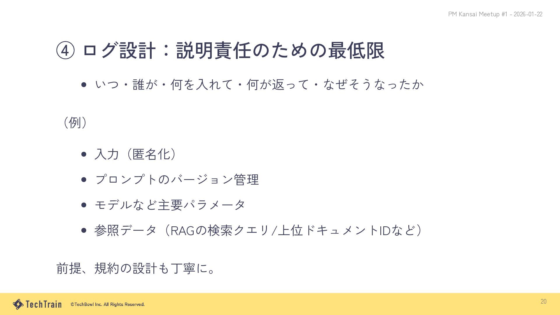 4. 丁寧なログ設計(説明責任) 5. 評価(テスト)のOps(定期検査) PM Kansai Meetup #1 - 2026-01-22 16
