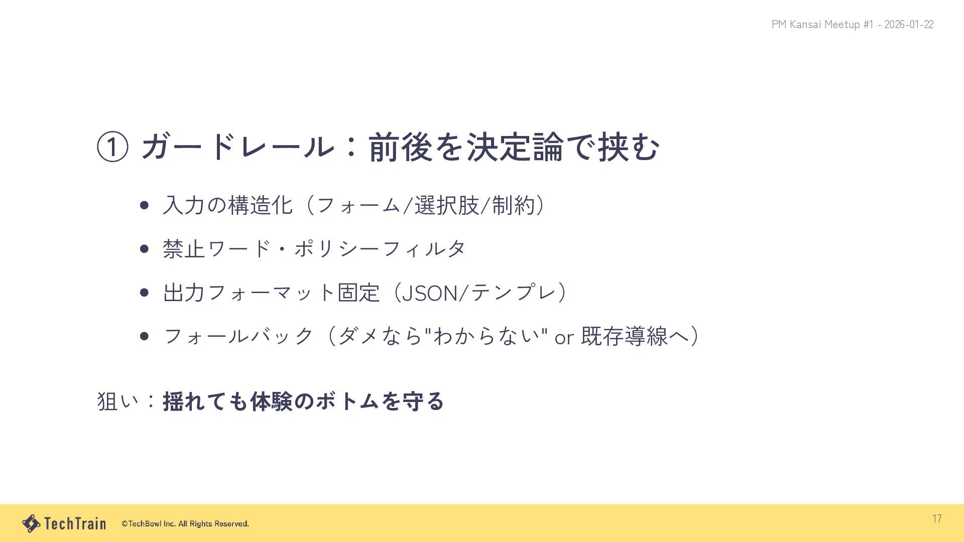 ① ガードレール:前後を決定論で挟む 入力の構造化(フォーム/選択肢/制約) 禁止ワード・ポリシーフィルタ 出力フォーマット固定(JSON/テンプレ) フォールバック(ダメなら"わからない" or 既存導線へ) 狙い:揺れても体験のボトムを守る PM