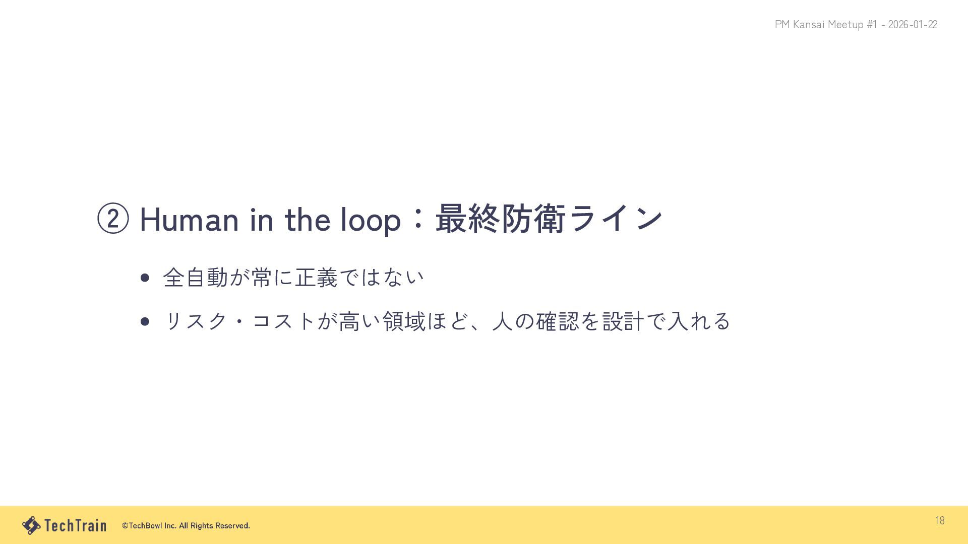 ② Human in the loop:最終防衛ライン 全自動が常に正義ではない リスク・コストが高い領域ほど、人の確認を設計で入れる PM Kansai Meetup