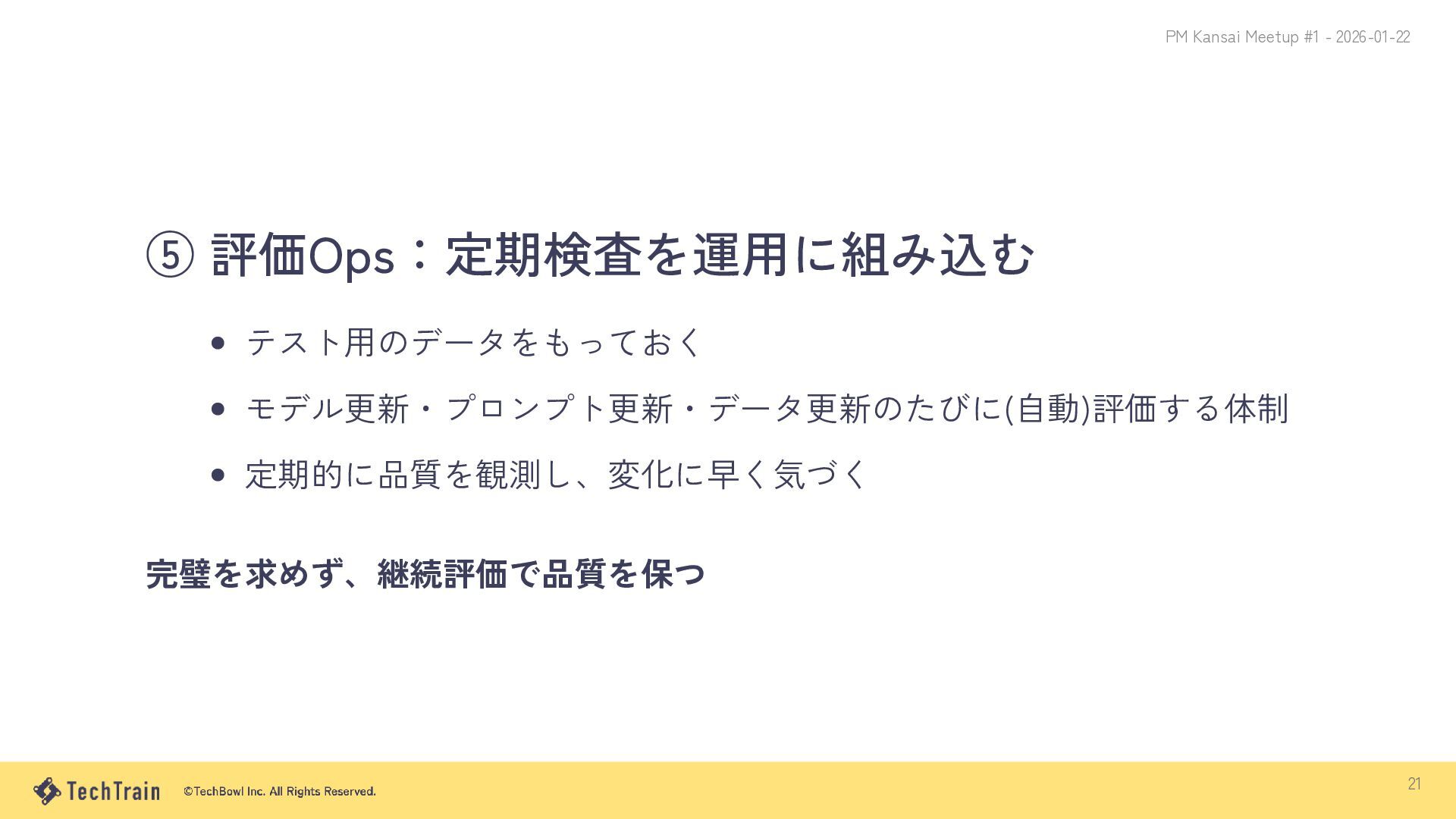 ⑤ 評価Ops:定期検査を運用に組み込む テスト用のデータをもっておく モデル更新・プロンプト更新・データ更新のたびに(自動)評価する体制 定期的に品質を観測し、変化に早く気づく 完璧を求めず、継続評価で品質を保つ PM Kansai Meetup #1