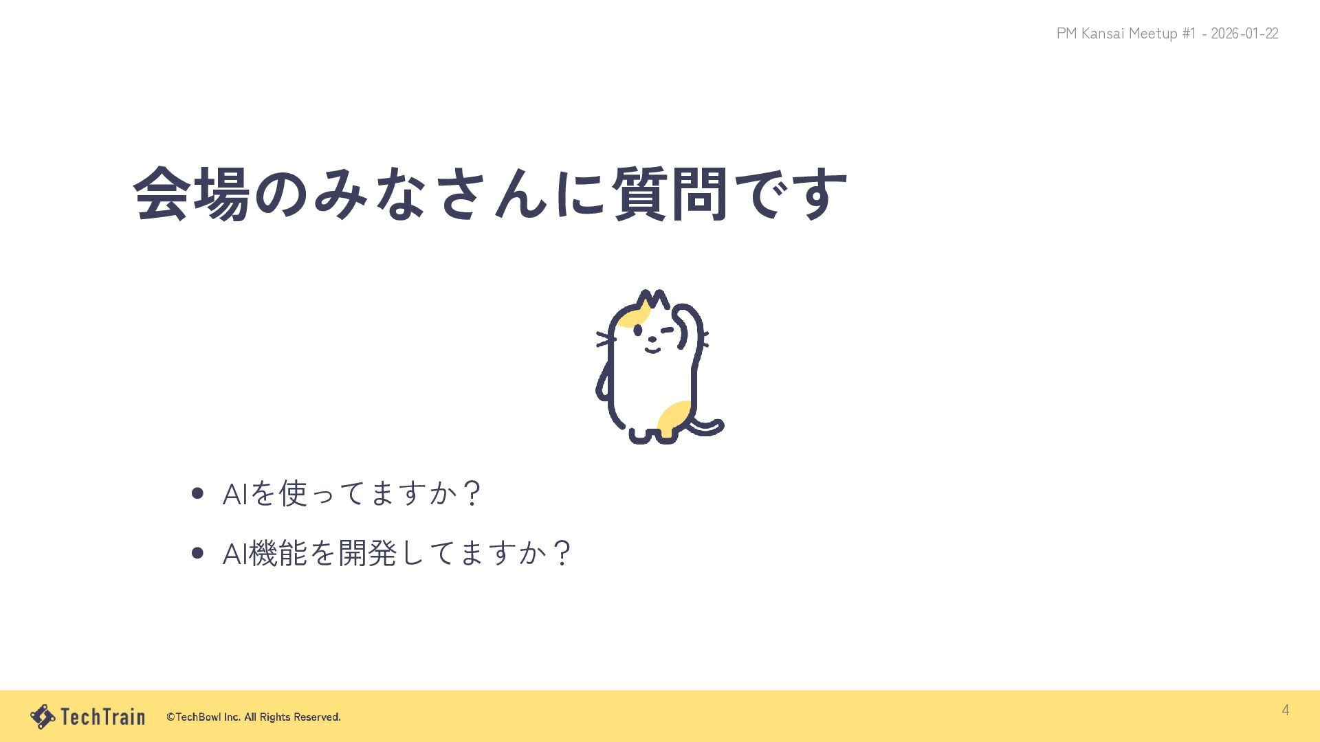 会場のみなさんに質問です AIを使ってますか? AI機能を開発してますか? PM Kansai Meetup #1 - 2026-01-22 4