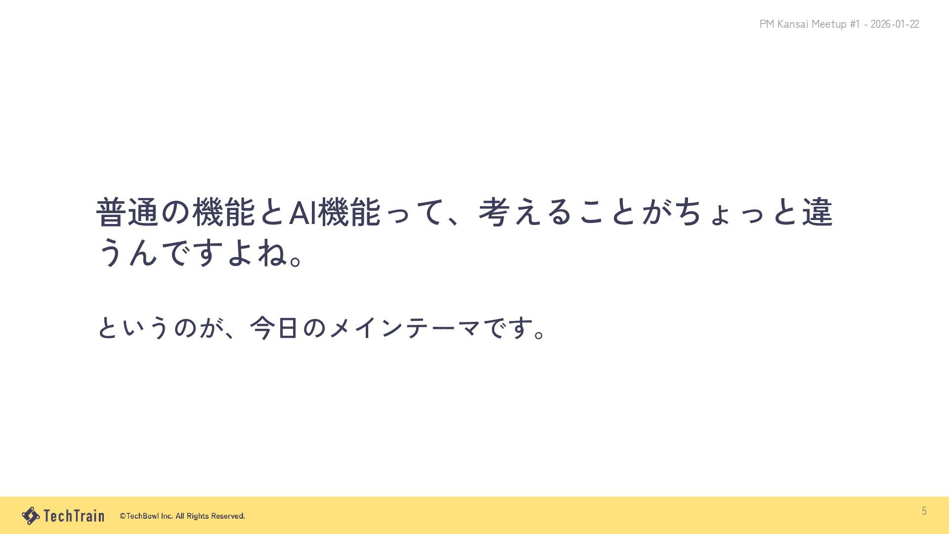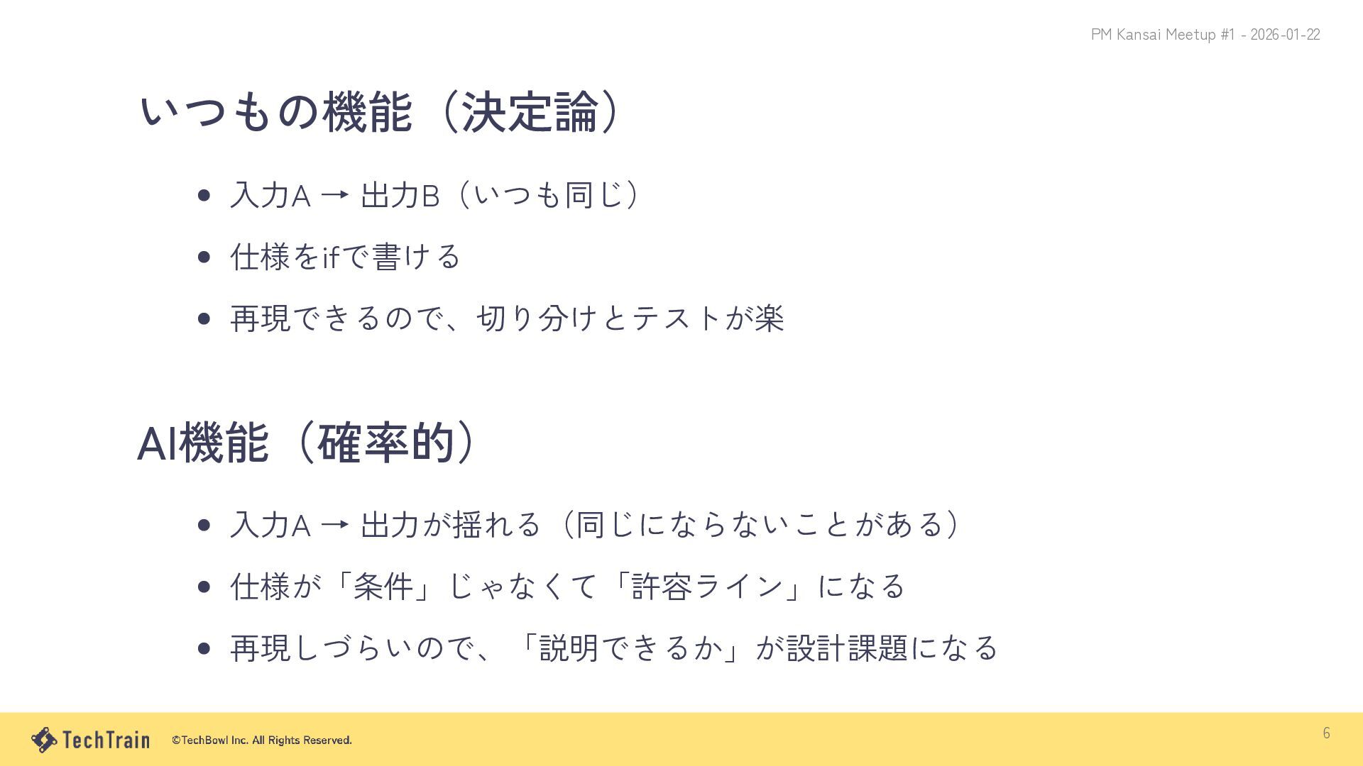 普通の機能とAI機能って、考えることがちょっと違 うんですよね。 というのが、今日のメインテーマです。 PM Kansai Meetup #1 - 2026-01-22 5