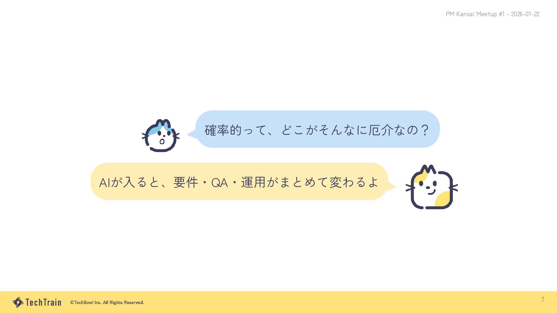 確率的って、どこがそんなに厄介なの? AIが入ると、要件・QA・運用がまとめて変わるよ PM Kansai Meetup #1 - 2026-01-22 7