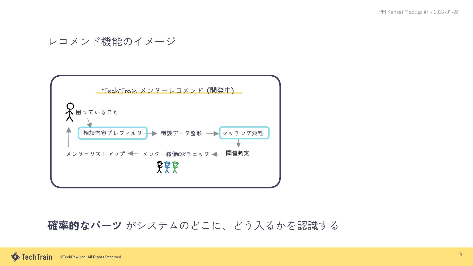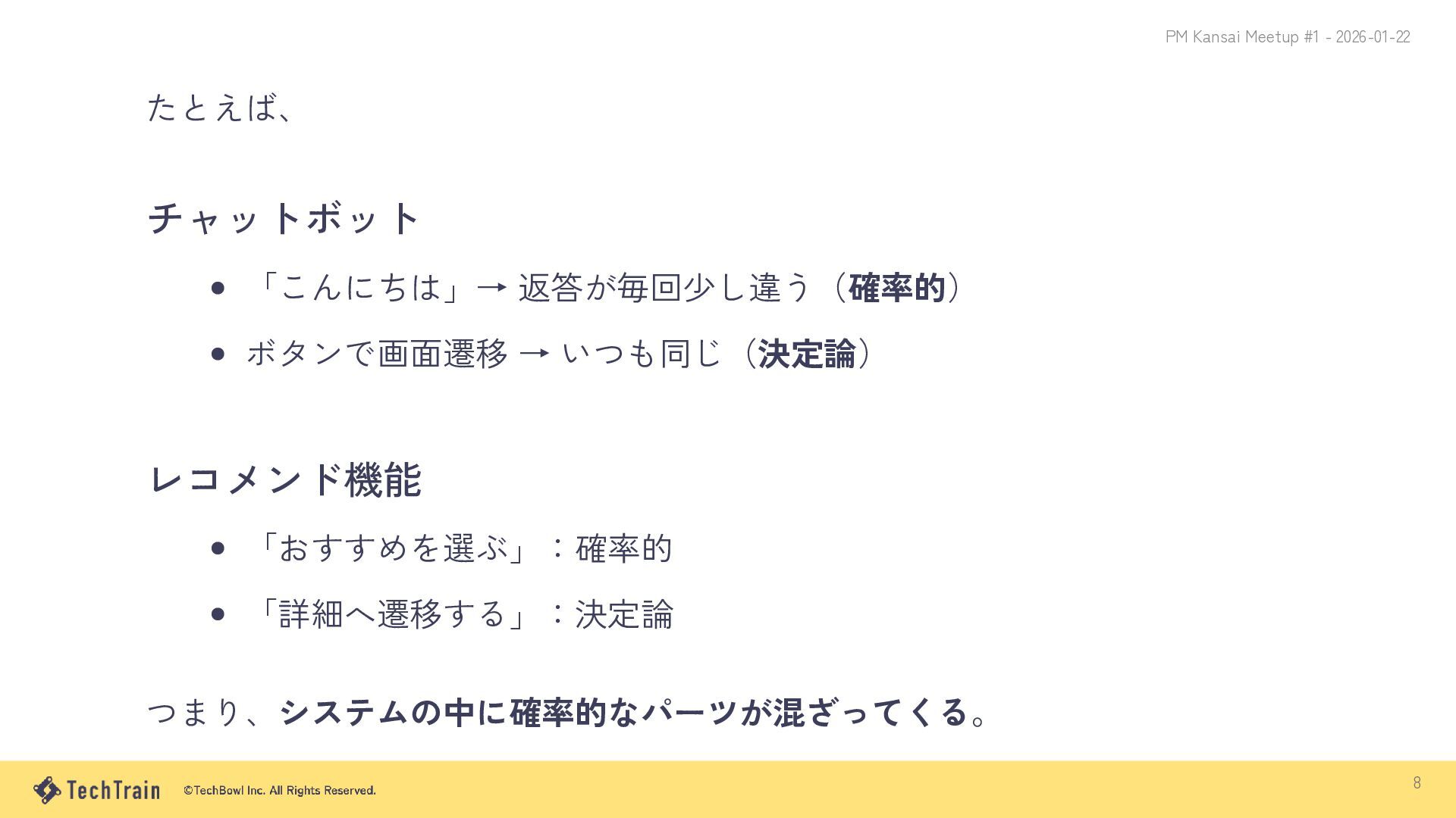 つまり、システムの中に確率的なパーツが混ざってくる。 PM Kansai Meetup #1 - 2026-01-22 8