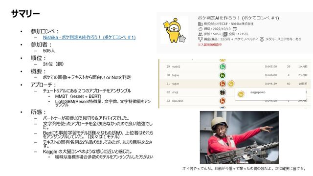 サマリー • 参加コンペ: – Nishika - ボケ判定AIを作ろう! (ボケてコンペ #1) •