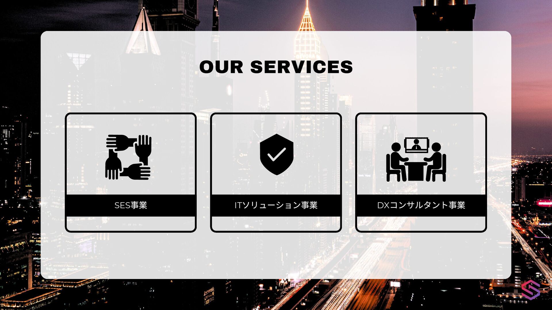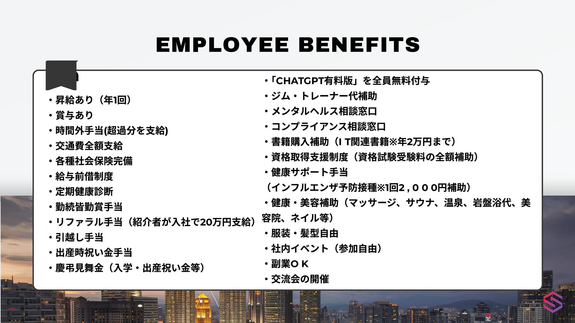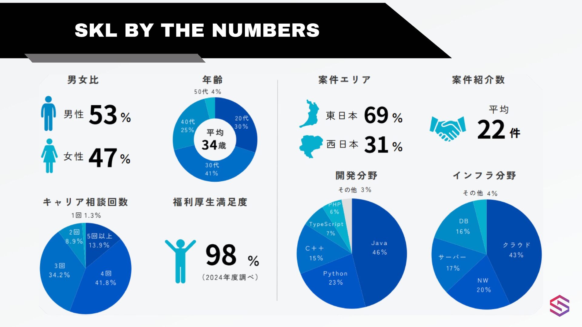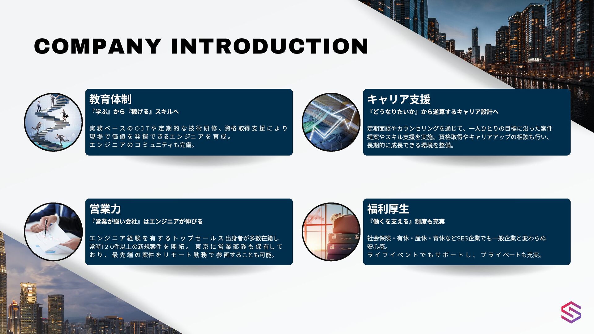 ス の O J T や 定 期 的 な 技 術 研 修 、資格 取得 支 援 に よ り 現 場 で 価 値 を 発 揮 で きるエ ン ジニ ア を 育 成 。 エ ン ジ ニ ア の コ ミ ュニティも完備。 キャリア支援 『どうなりたいか』から逆算するキャリア設計へ 定期面談やカウンセリングを通じて、一人ひとりの目標に沿った案件 提案やスキル支援を実施。資格取得やキャリアアップの相談も行い、 長期的に成長できる環境を整備。 福利厚生 『働くを支える』制度も充実 社会保険・有休・産休・育休などSES 企業でも一般企業と変わらぬ 安心感。 ラ イ フ イ ベ ン ト で も サ ポ ー ト し 、 プ ラ イ ベートも充実。 営業力 『営業が強い会社』はエンジニアが伸びる エ ン ジ ニ ア 経 験 を 有 す る ト ッ プ セ ー ル ス 出身者が多数在籍し 常時1 2 0 件以上の新規案件 を 開 拓 。 東 京 に 営 業 部 隊 も 保 有し て お り 、 最 先 端 の 案件 を リ モ ー ト 勤 務 で 参 画することも可能。